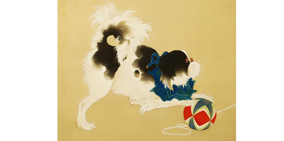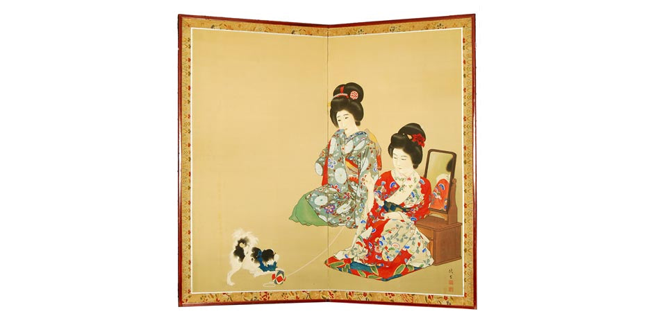 Antique Japanese screen featuring Maiko playing with a chin puppy