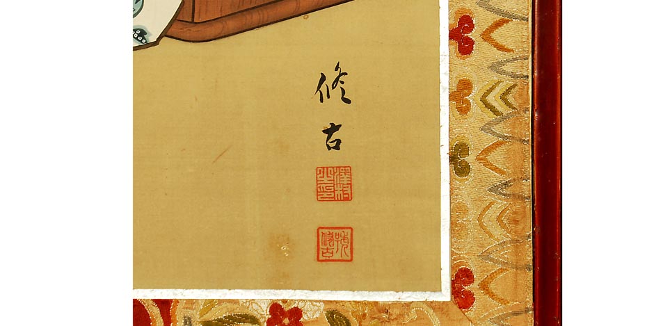 The Maiko, dressed in their vibrant kimonos, are shown in an intimate and playful moment with the Japanese Chin, a small and fluffy dog known for its gentle and affectionate nature. The interaction between the Maiko and the puppy symbolizes youth, beauty, and the softening influence of nature in an otherwise formal world. The signed work suggests the personal touch of a masterful artist, whose delicate brushwork and use of color convey a sense of warmth and playfulness.