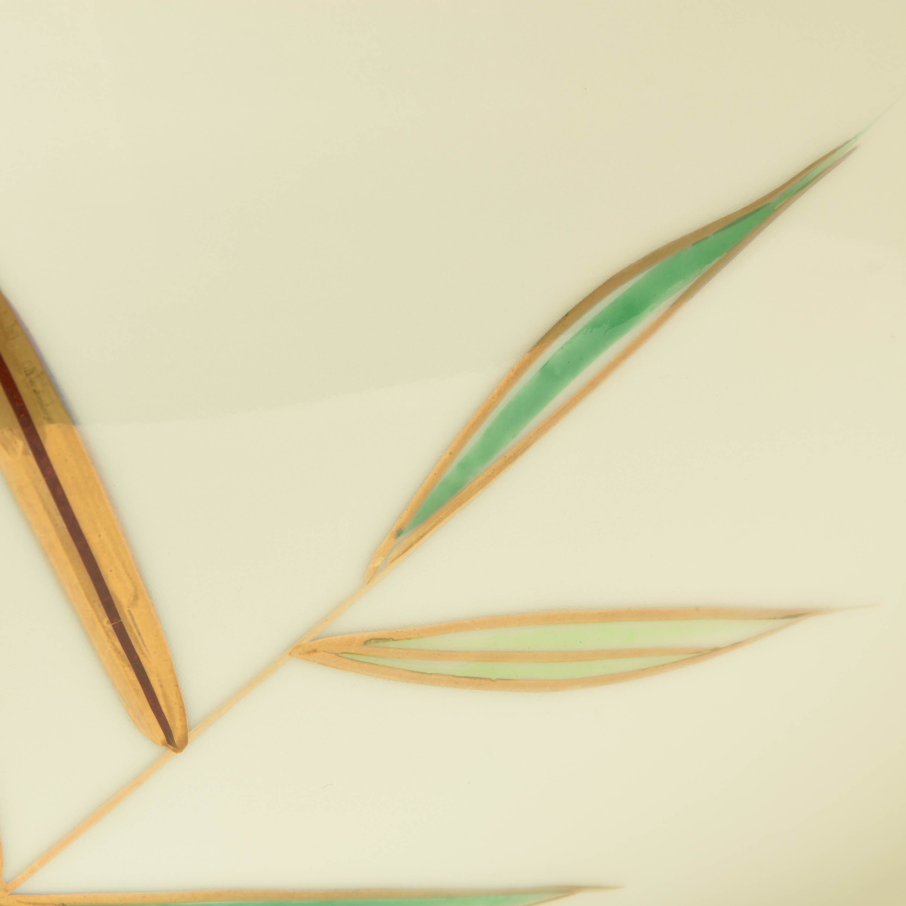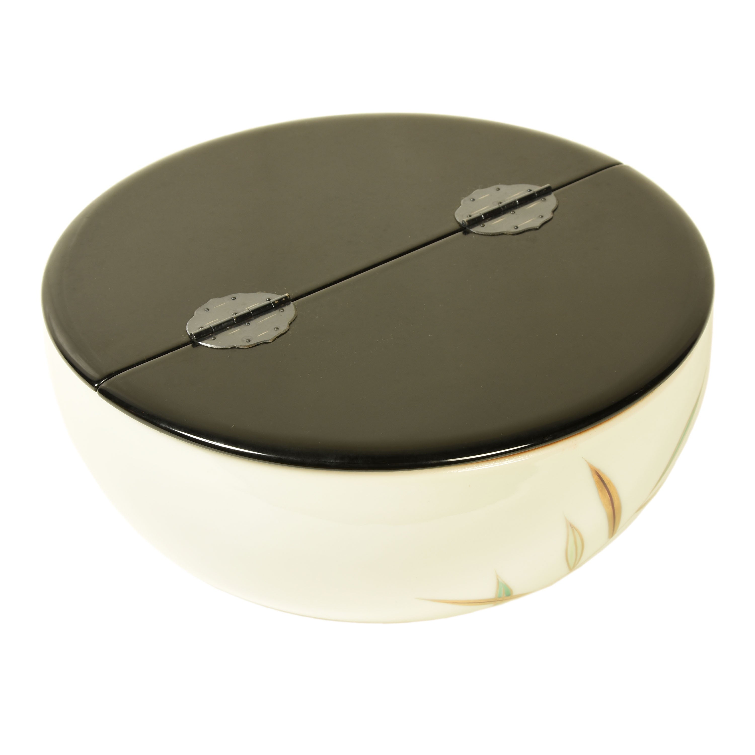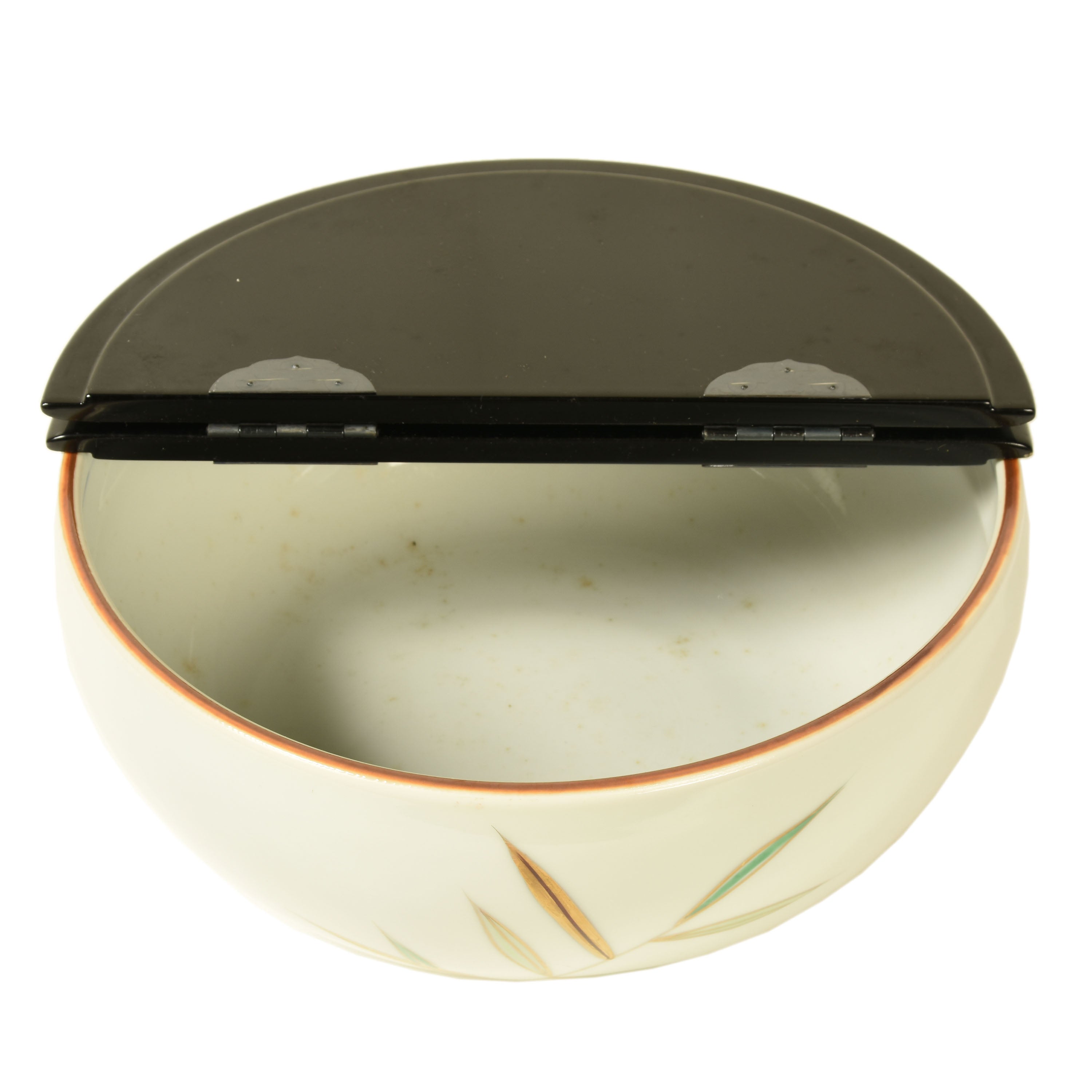 A vintage Japanese porcelain mizusashi, a water pot used for tea ceremony, with a black lacquer hinged lid. It has a hand painted and gilded design of bamboo leaves. c.1970's.