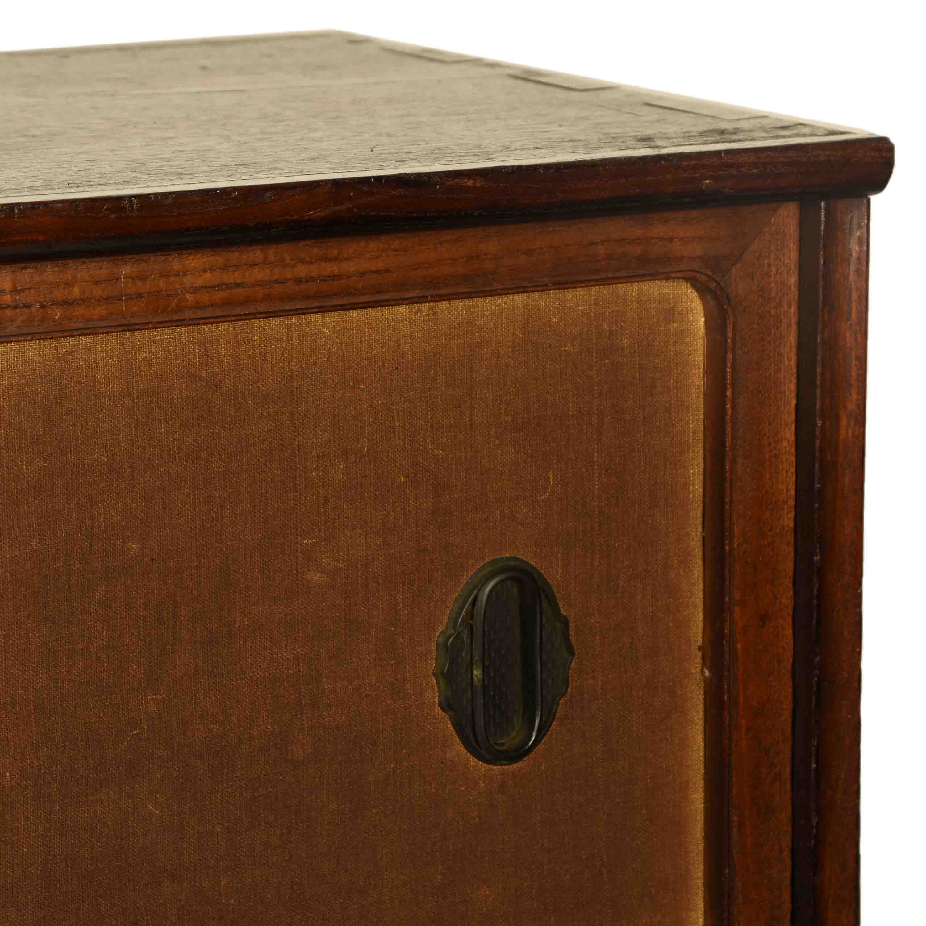 A Japanese chest of drawers from the Taisho period (c.1920), crafted from chestnut wood with a paulownia interior. The piece features two sliding doors covered in gold silk, merging traditional Japanese craftsmanship with refined decorative elegance.