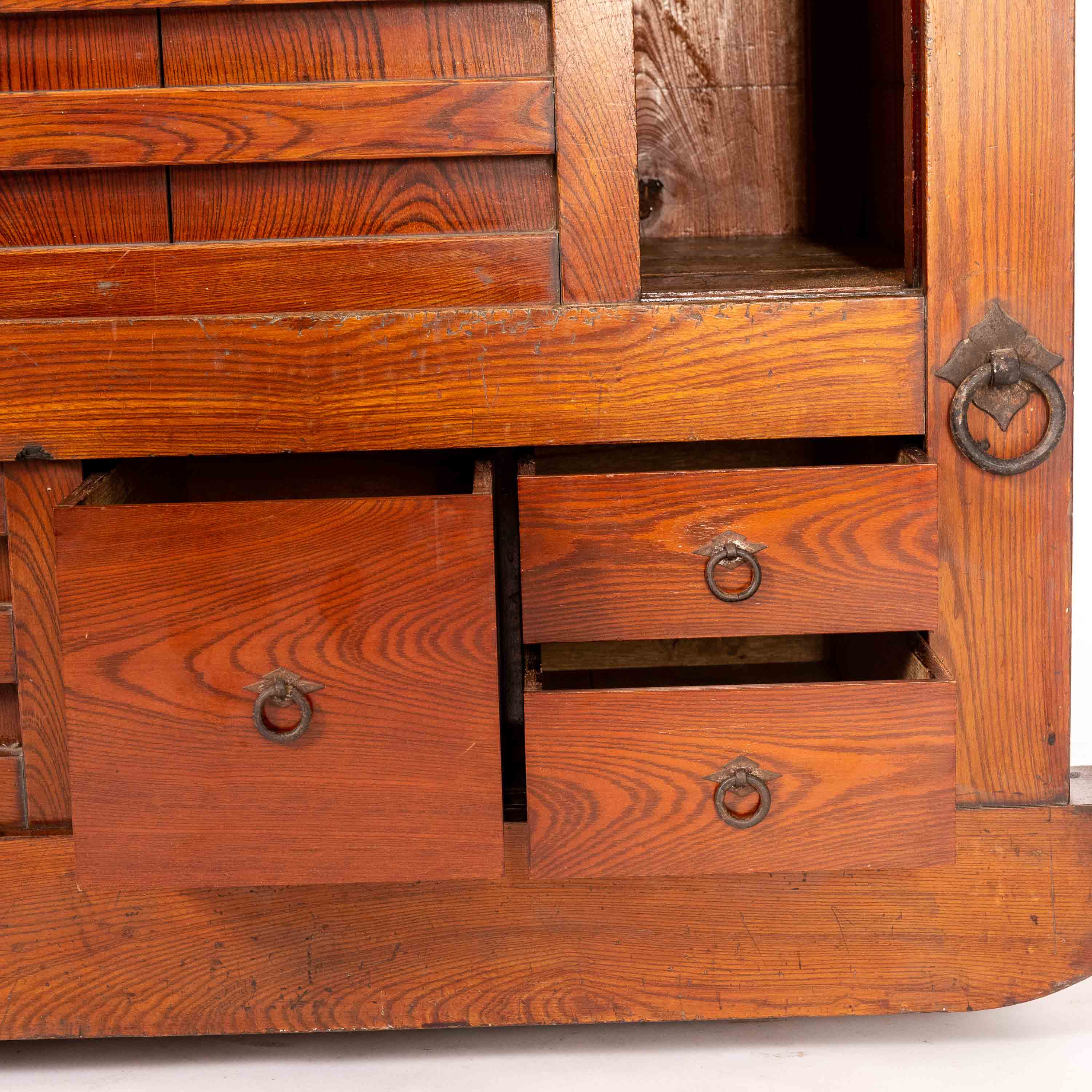 A rare lacquered Kuruma Dansu, or wheeled storage chest, from the Edo period, first half of the 19th century. Crafted almost entirely from zelkova wood, prized for its strength and striking grain, with paulownia wood drawer linings for protection and subtle fragrance, this chest exemplifies functional elegance and refined craftsmanship.