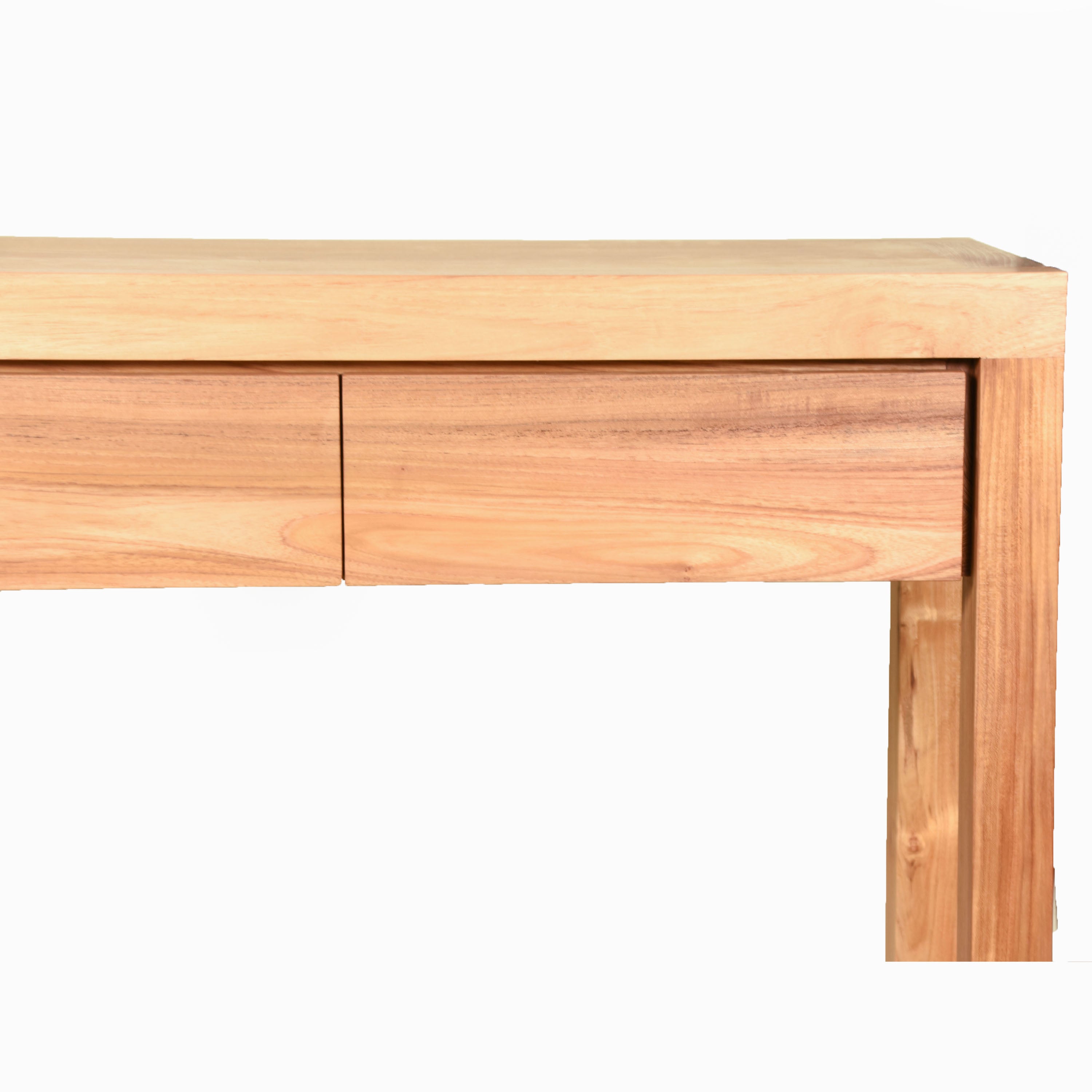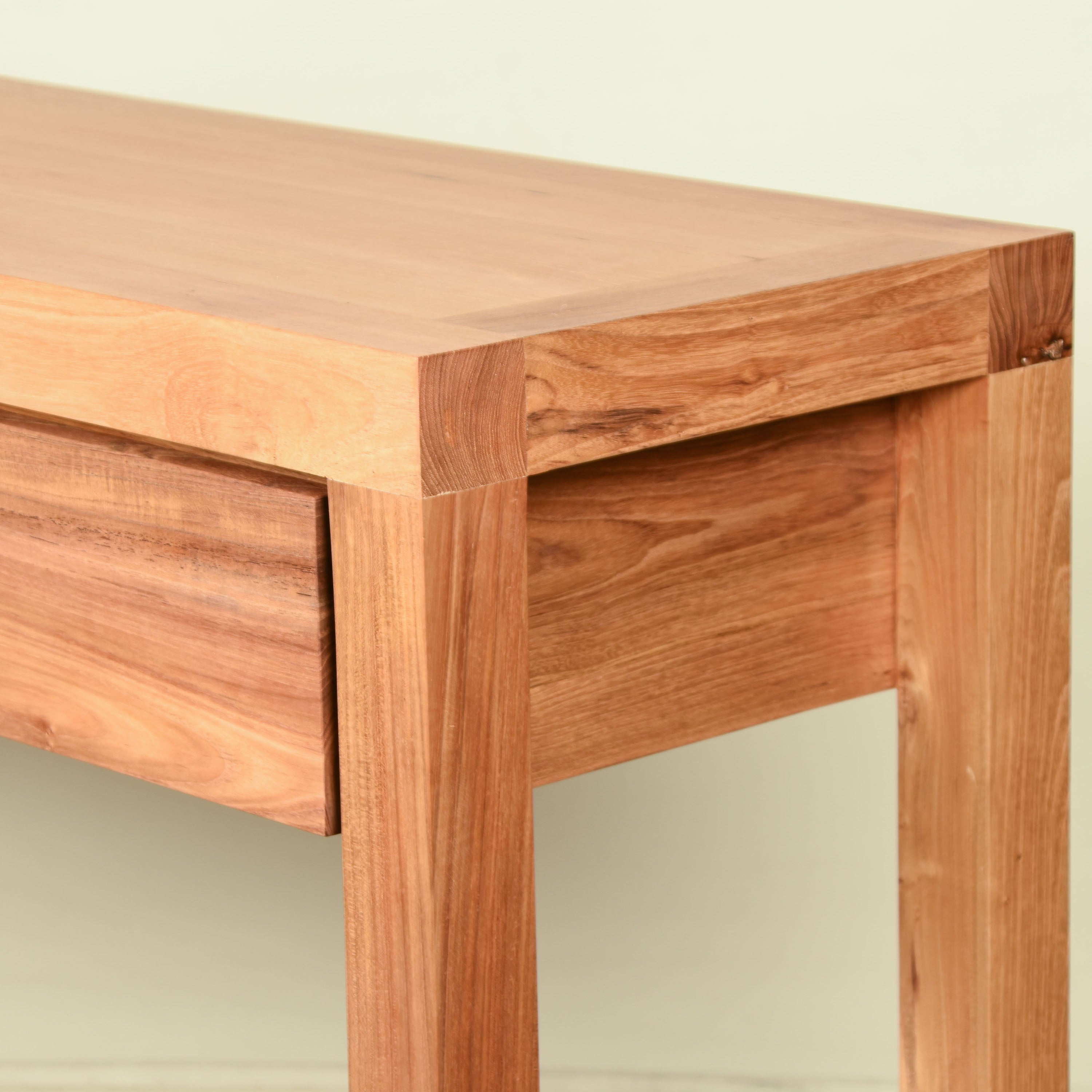 This Contemporary Scandinavian-style 3-drawer console, inspired by Mid-Century Modern (MCM) design, is crafted by fine craftsmen using sustainably sourced solid teak—not veneer or laminate—ensuring both durability and eco-friendly appeal. Finished with a natural wax finish, the wood’s beautiful grain is enhanced, giving the piece a smooth, matte texture that radiates natural warmth and elegance.