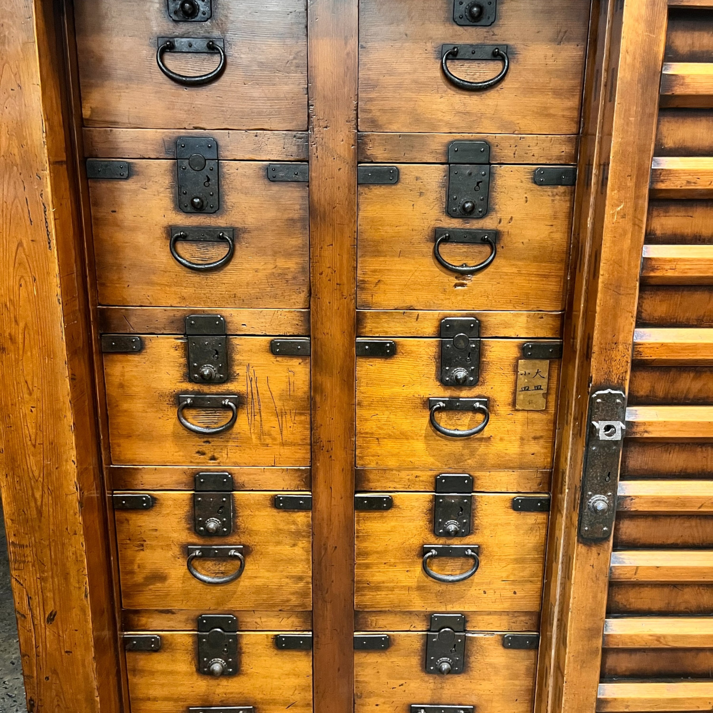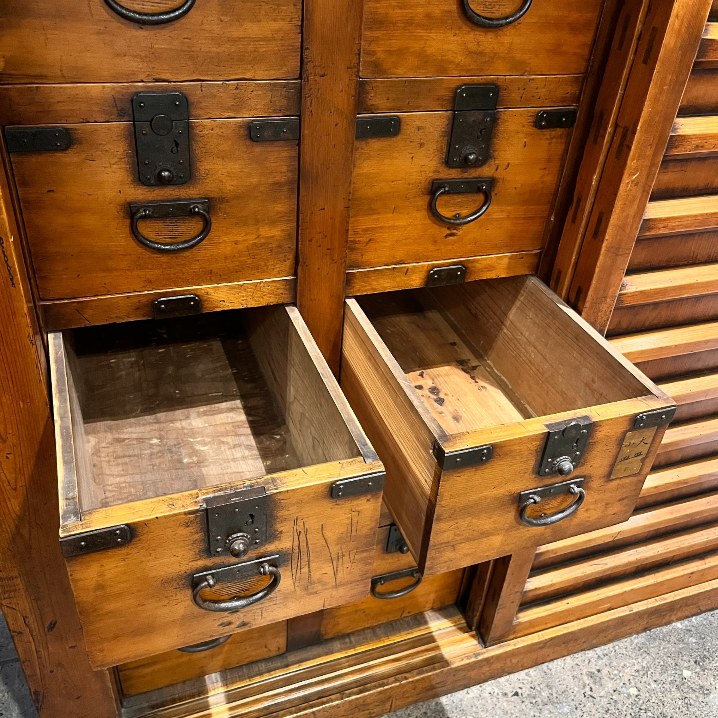 Originally designed for merchants to store documents, receipts, and valuables, it exemplifies the precision and artistry of Edo-period Japanese craftsmanship. Its generous size makes it a striking and functional storage solution for modern interiors or a collectible centerpiece for enthusiasts of fine Japanese antiques.