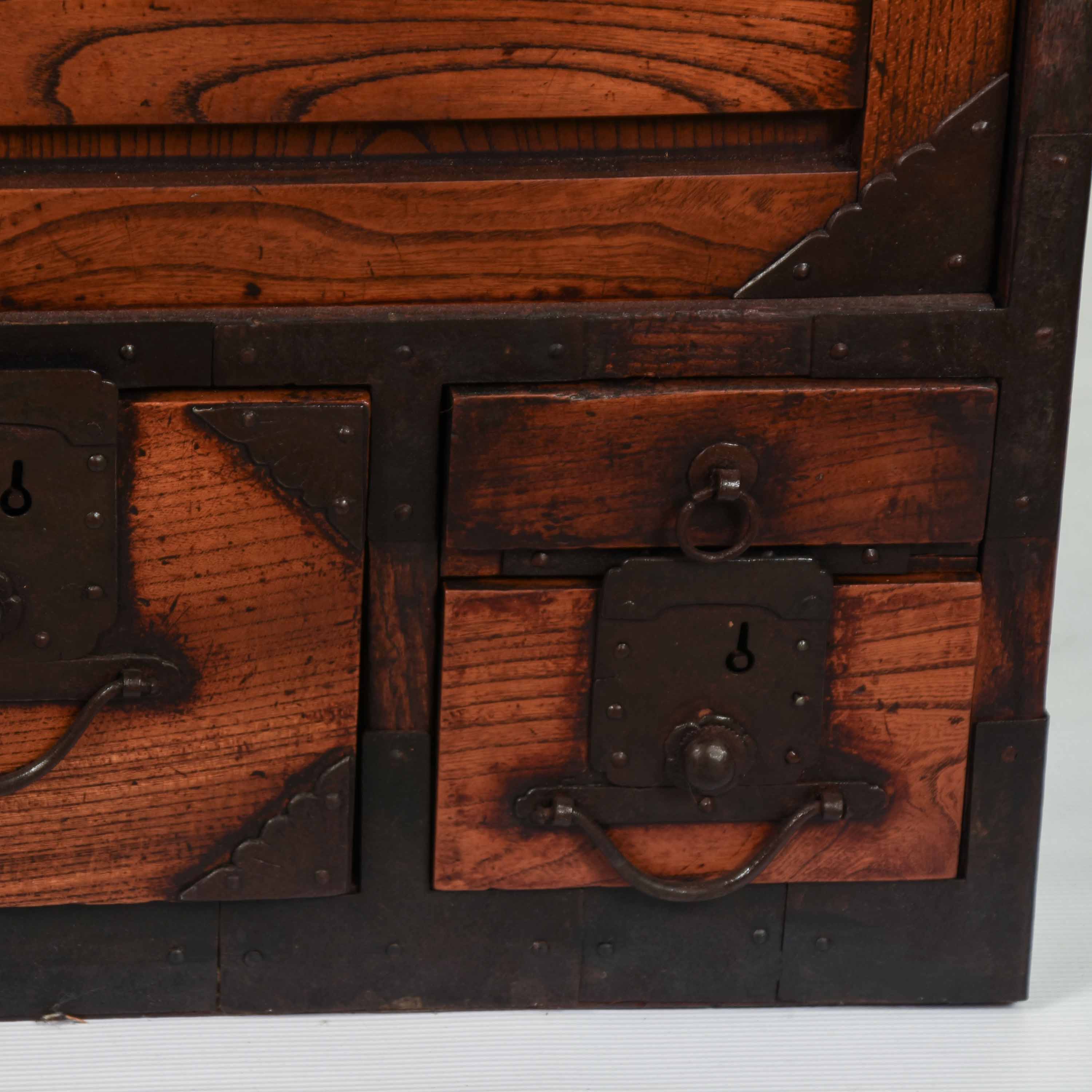 A Japanese Fune Dansu, traditionally used by sea captains to store documents, valuables, and a writing box, dating to the early 19th century Edo period. Crafted from zelkova wood for durability and beauty, with paulownia wood drawer linings for protection, this chest exemplifies both functionality and refined craftsmanship.