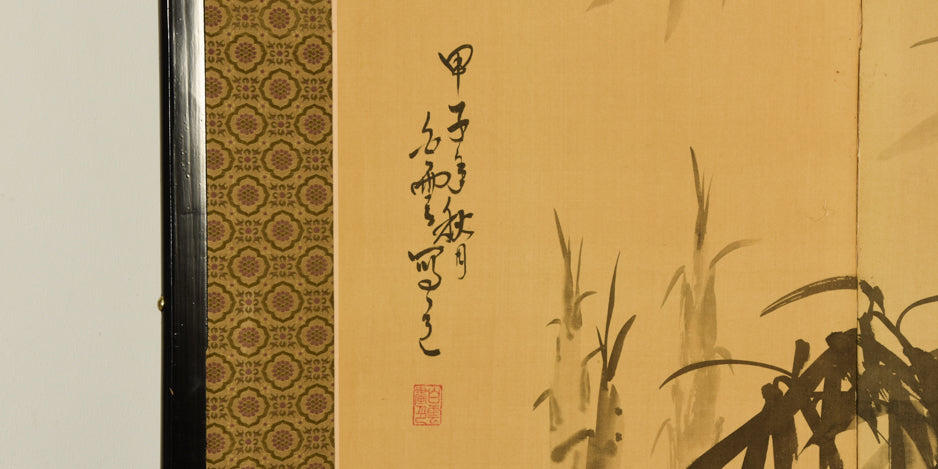 This antique Japanese 2-panel screen from the Meiji period features a beautiful sumi-e ink painting of bamboo on silk, surrounded by an elegant brocade border. The bamboo, often a symbol of strength and resilience in Japanese art, is depicted in a traditional and minimalist style, showcasing the fluidity and subtlety of sumi-e (Japanese ink painting). The use of silk as a medium adds to the delicacy and refinement of the piece.