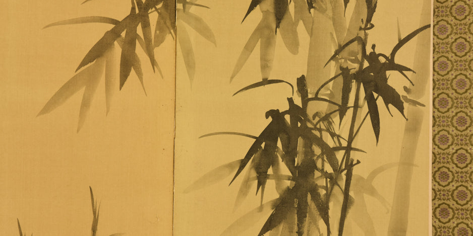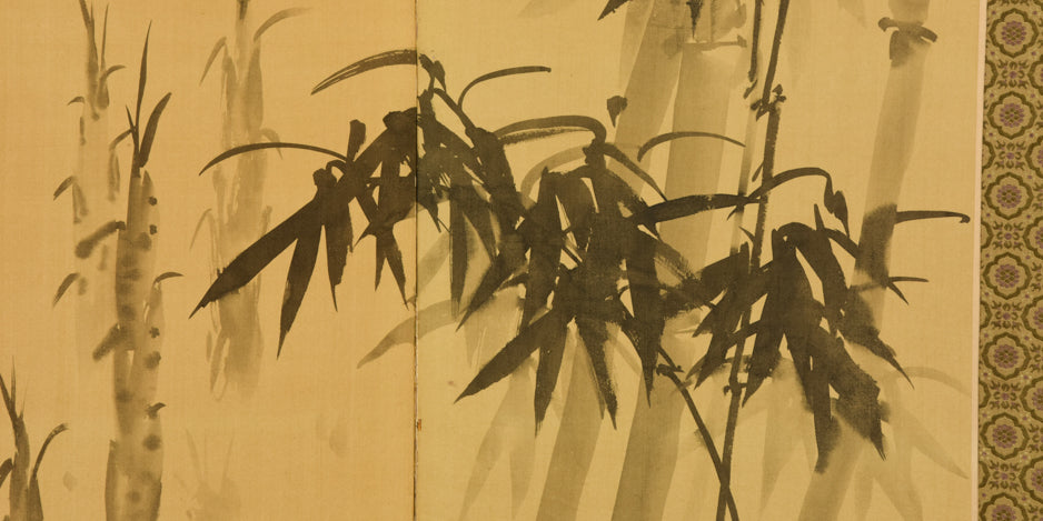 Antique Japanese 2-Panel Screen – Sumi-e Bamboo Painting on Silk with Brocade Border – Meiji Period (19th Century)