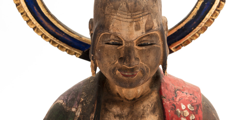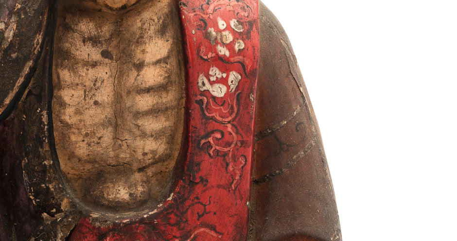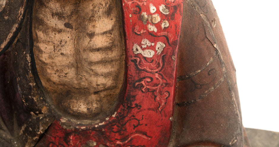 Rare 18th Century arhat Ksitigarbha, also known as Jizo, of lacquered and carved wood.