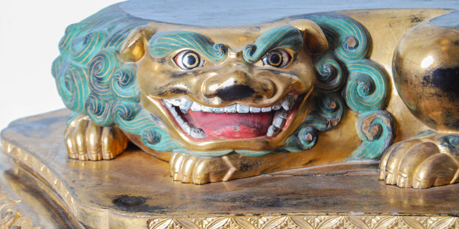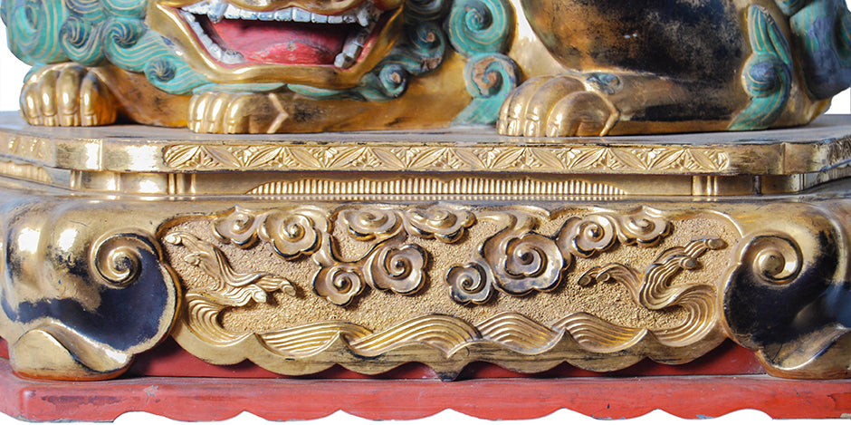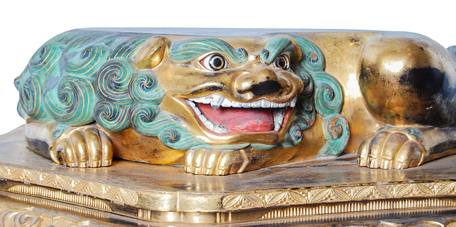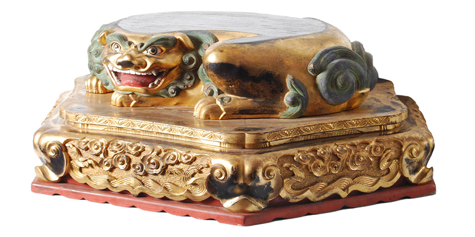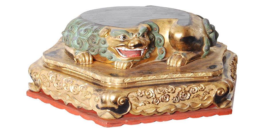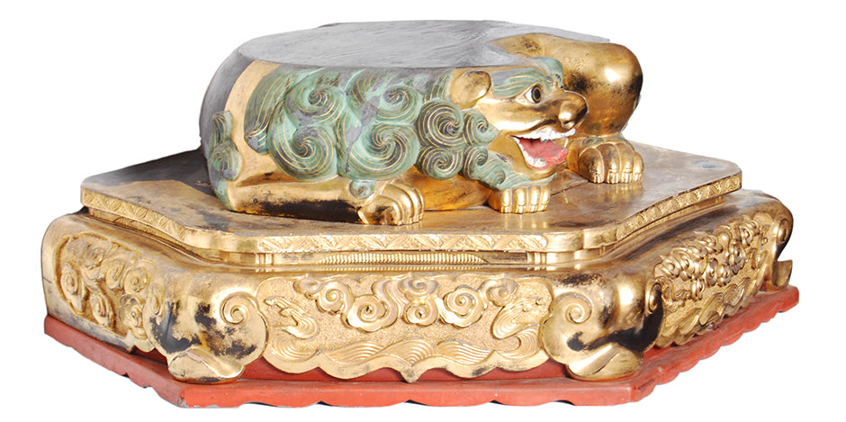 Rare and unusual hexagonal Japanese Buddhist base for a statue with a recumbent shi-shi (guardian lion dog), gilded and carved with inset glass eyes and painted with mineral pigments - Early Edo period, 17th century.