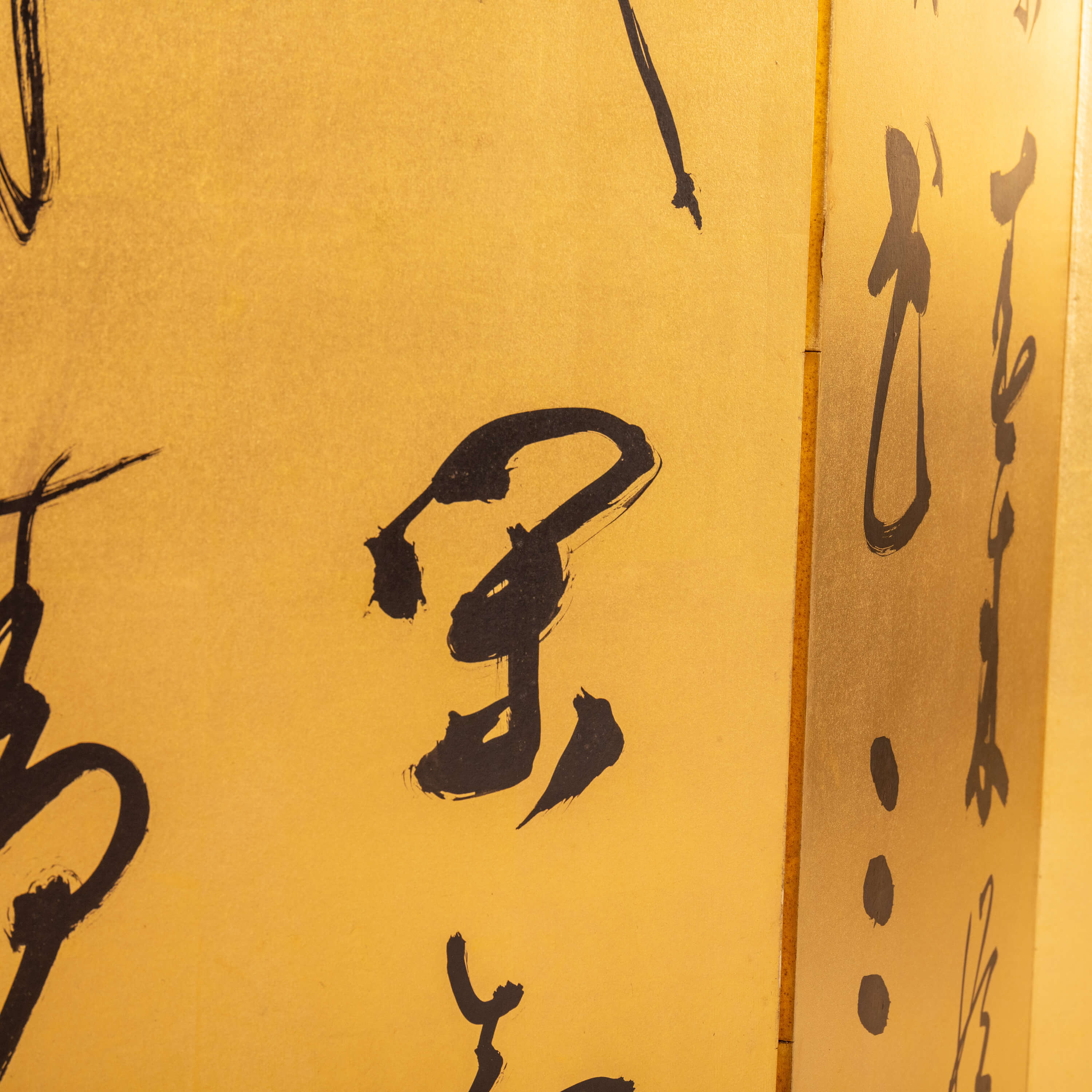 This screen is an exceptional example of Japanese calligraphy on a gold leaf background, and it would make an impactful addition to any collection, bringing a touch of traditional Japanese elegance into your space.