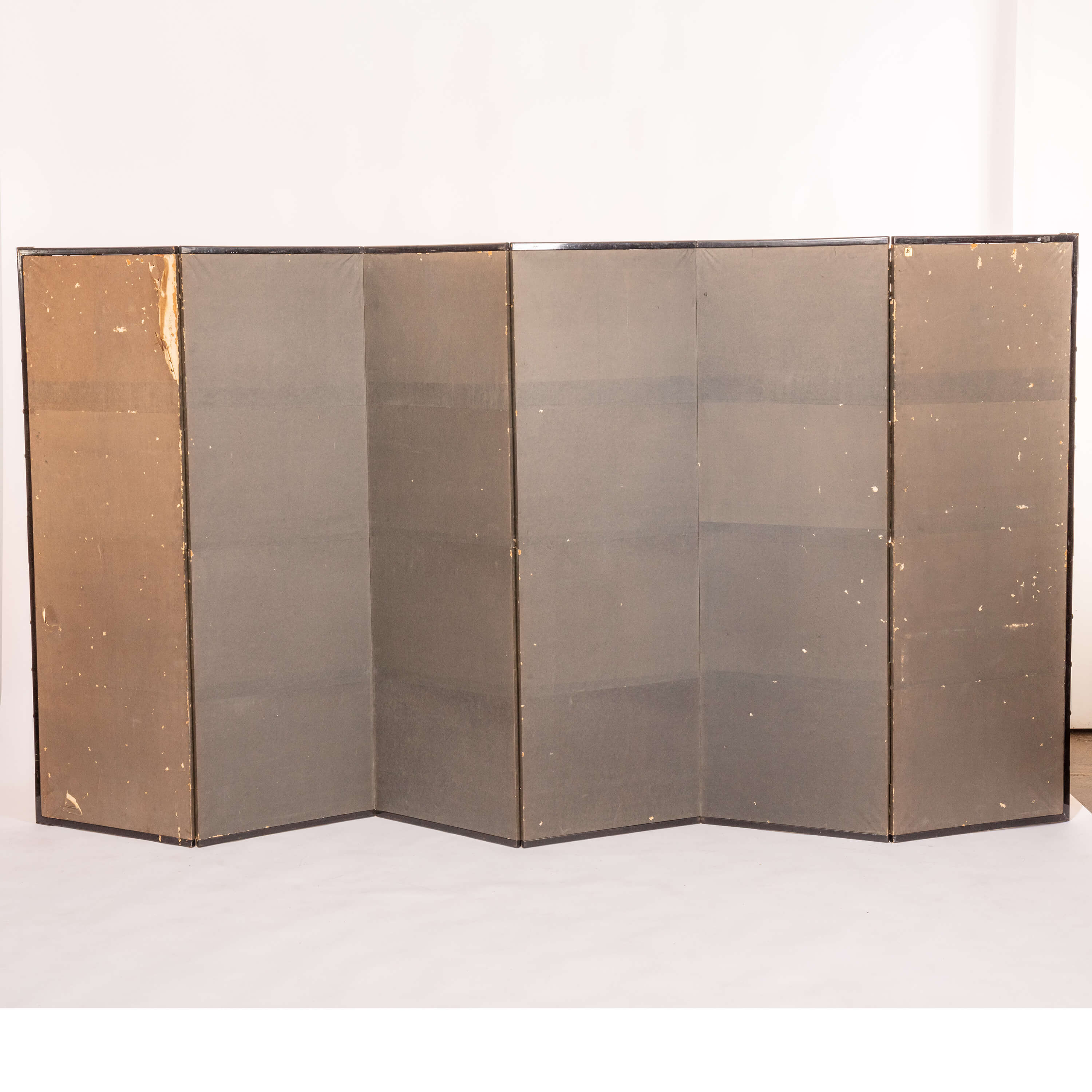 This six-panel Japanese calligraphy screen features exquisite ink calligraphy set against a stunning gold leaf background, dating to the Meiji period, around circa 1900. The use of gold leaf elevates the elegance of the screen, adding a rich, luminous quality to the artwork.