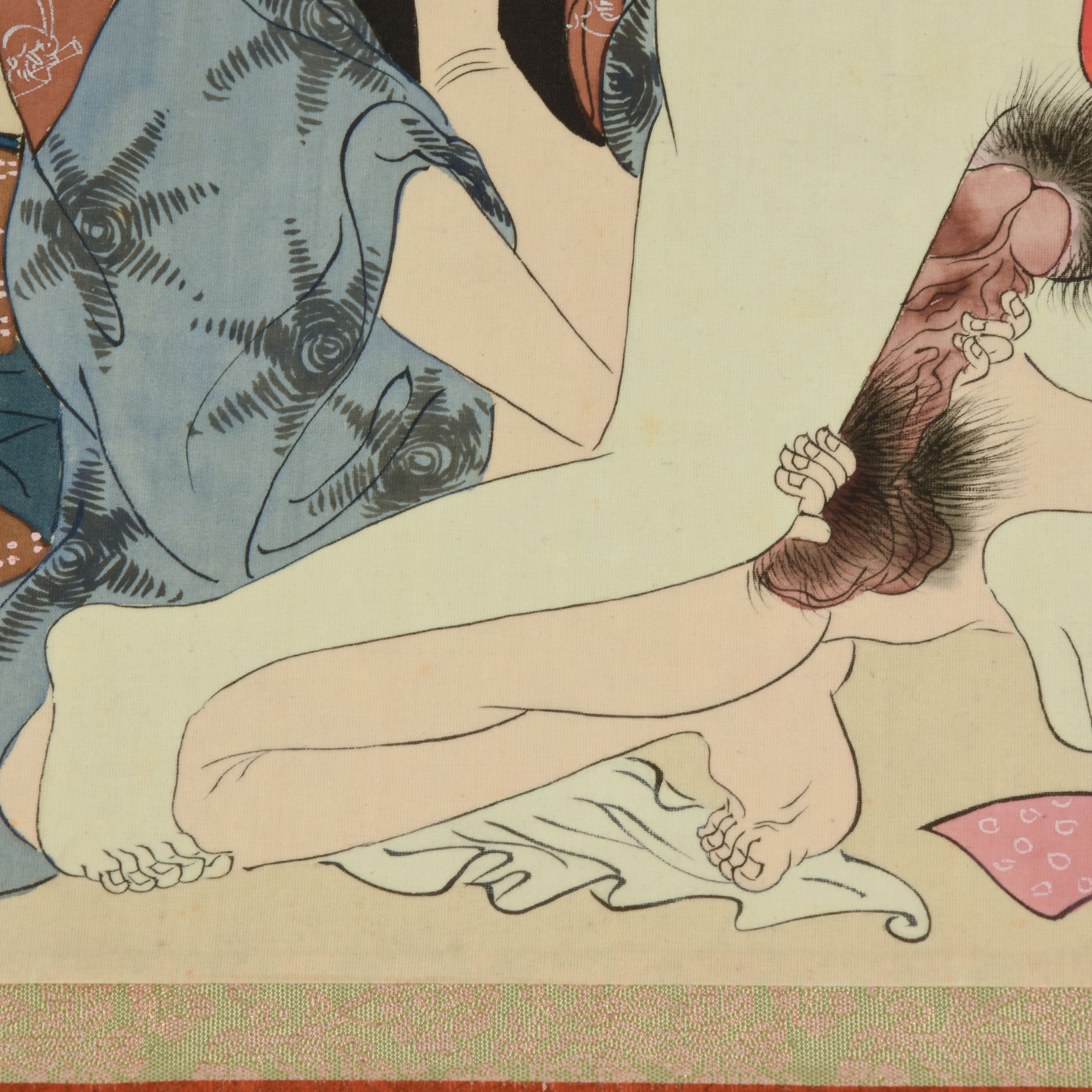 An antique Japanese Shunga painting from the Meiji period, mounted on silk brocade (unframed). Shunga (春画), literally “pictures of spring,” is a traditional form of Japanese erotic art, often linked to ukiyo-e. While commonly seen in woodblock prints, rare painted handscrolls like this one predate ukiyo-e, showcasing the artistic and cultural significance of intimate depictions in Japanese history.