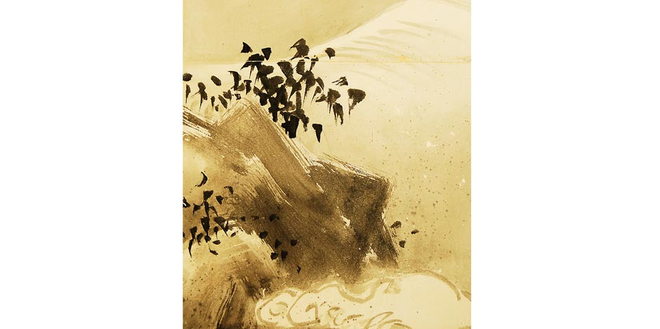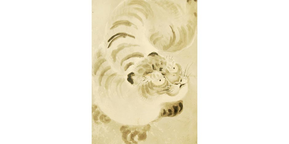 The Kano school was renowned for its mastery in combining decorative elegance with natural realism, and this screen is a striking example of that tradition. The tiger is rendered with powerful brushstrokes, capturing its muscular form and fierce presence. The bold depiction of the animal is balanced with a delicate background, a hallmark of Kano school painting, where the artist carefully juxtaposes the force of the tiger with a subtle natural setting.