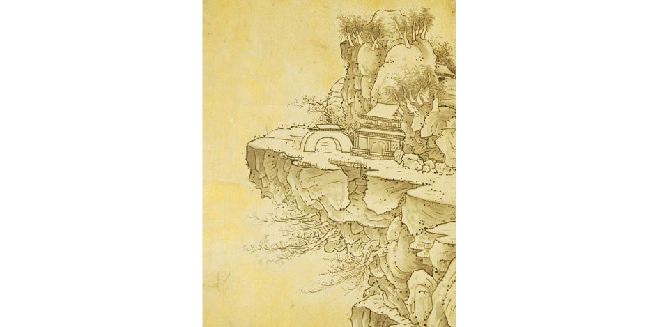 The landscape features mountainous terrain, flowing rivers, and barren trees, all rendered with fluid brushstrokes and a deep sense of serenity and spiritual contemplation. The use of light ink washes and delicate detailing brings the natural world to life, emphasizing the harmony between human life and the surrounding landscape—central themes in Chinese literati painting.
