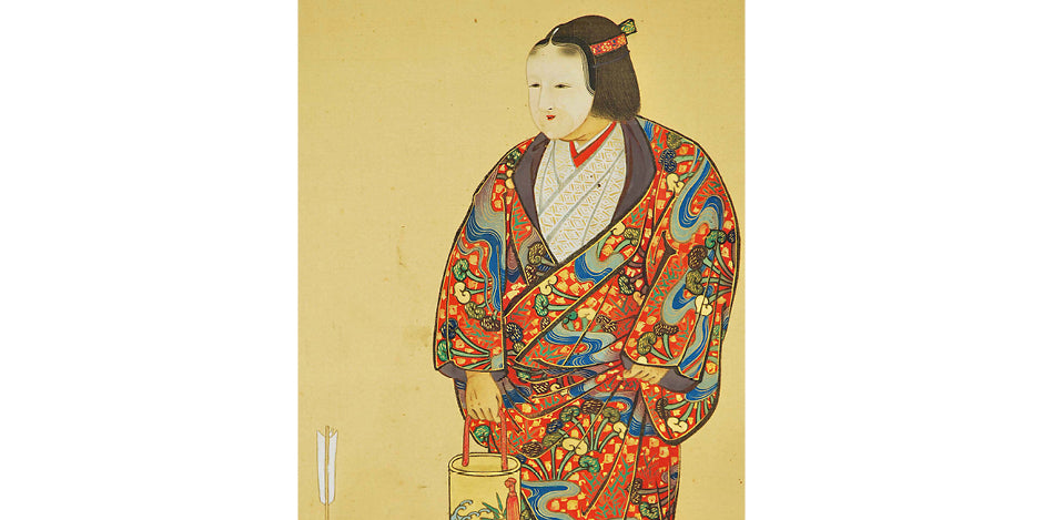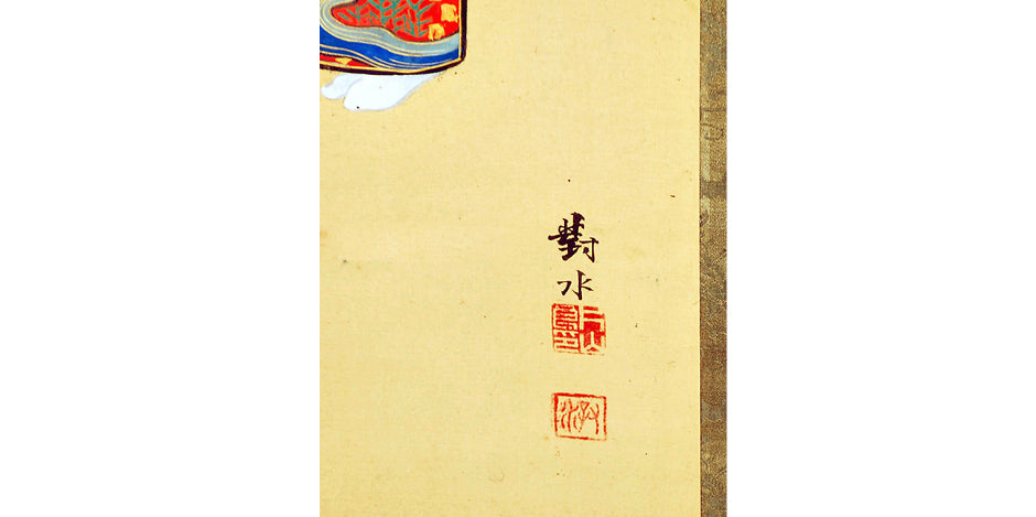 This antique Japanese scroll features a Noh theatre performer dressed in traditional attire and a Noh mask, capturing the essence of one of Japan's most revered theatrical traditions. The Noh theatre, known for its stylized performances, uses elaborate masks and minimal movement to convey emotion and narrative, often focusing on themes of ghosts, spirits, and historical figures. This scroll exemplifies the intricate beauty of Noh theatre and its deep cultural significance.