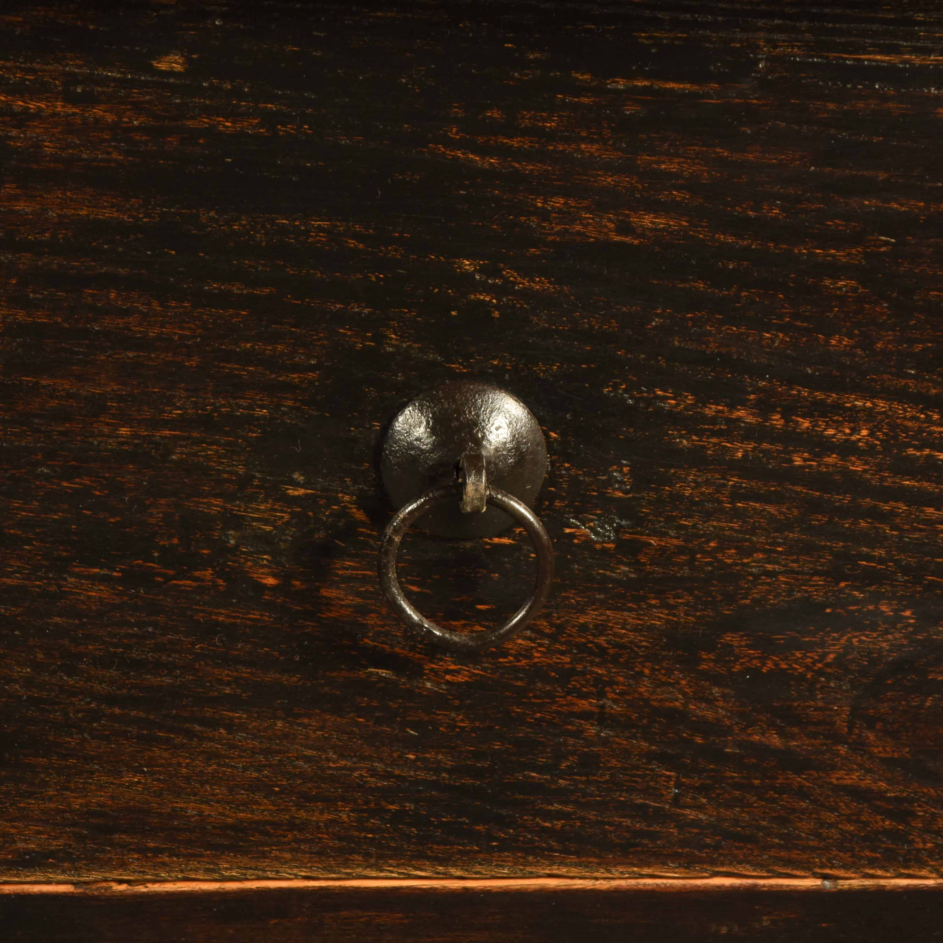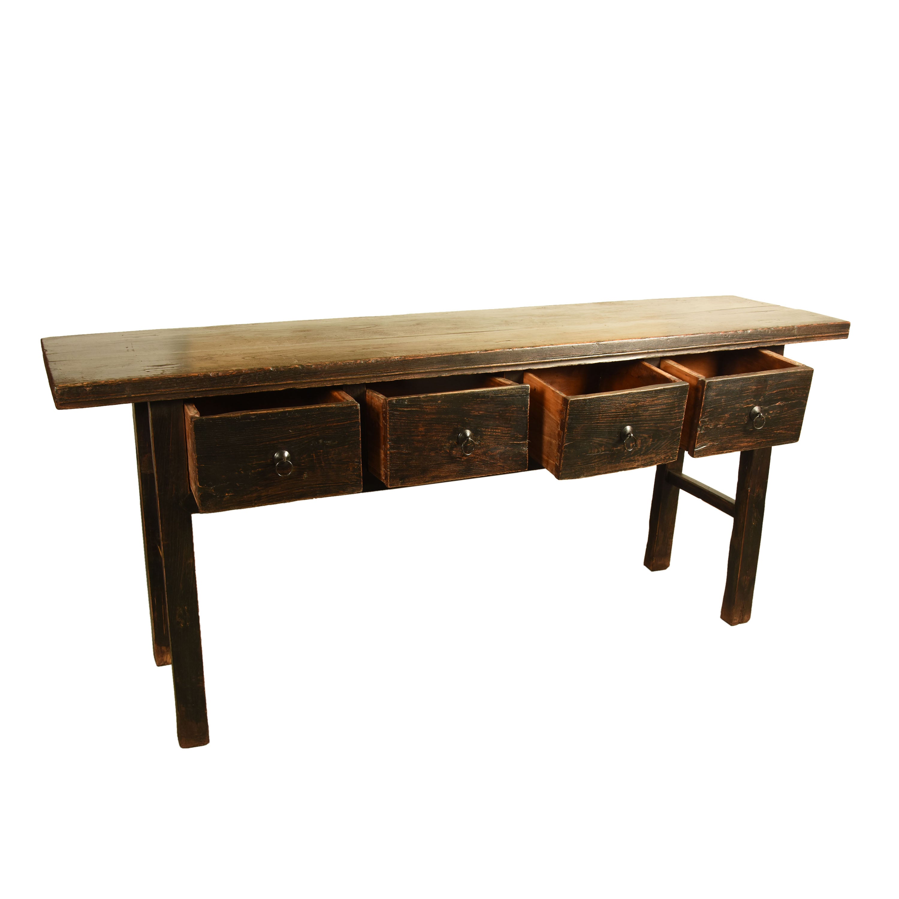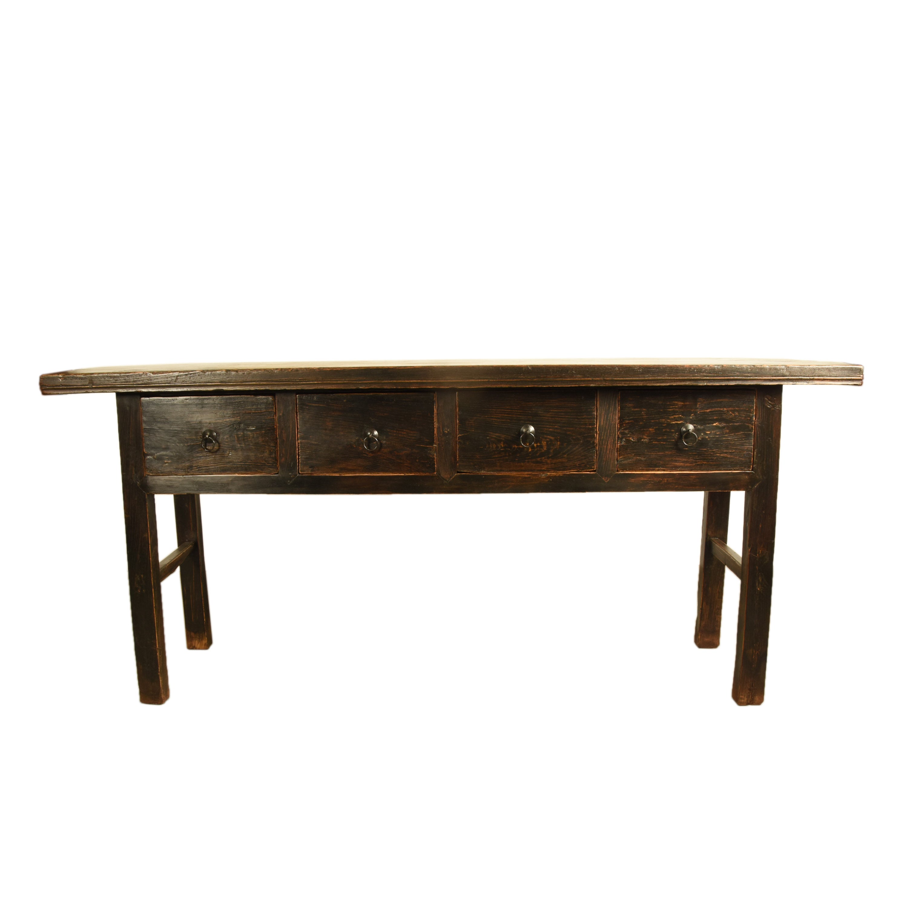 This antique provincial Chinese writing table from the late 19th century, during the Qing dynasty, is crafted from solid elm wood, offering a beautiful blend of rustic charm and design simplicity. The table features four deep drawers, each equipped with traditional iron ring pull handles, providing both functional storage and an elegant aesthetic. The clean lines and uncomplicated design make it an ideal addition to any modern home, while its aged wood and subtle detailing give it timeless appeal.