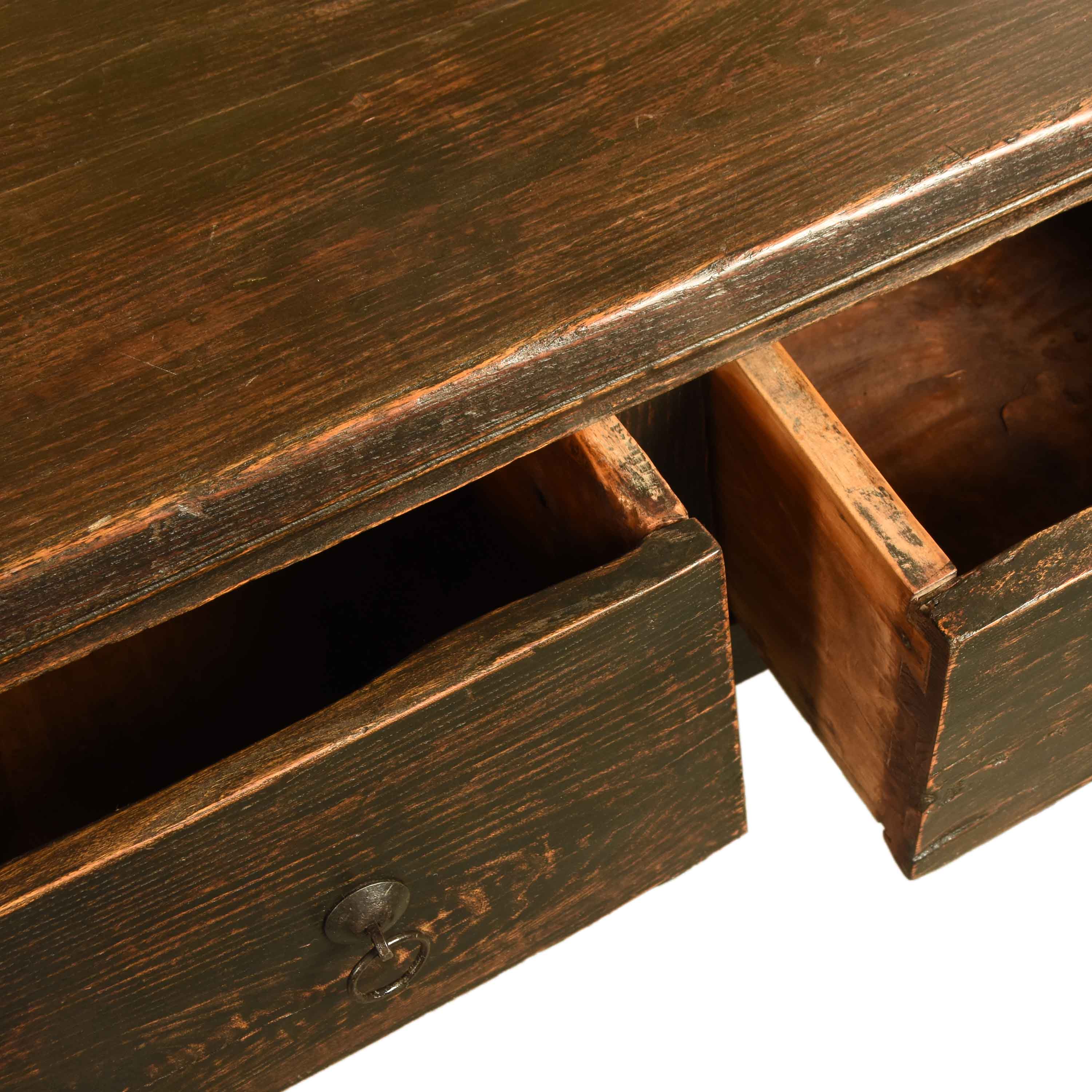 The warm patina of the elm wood adds depth and character to the piece, reflecting its history while seamlessly fitting into contemporary interiors. Whether used as a writing desk, console table, or hall table, this piece brings a sense of authenticity and refinement to any room.
