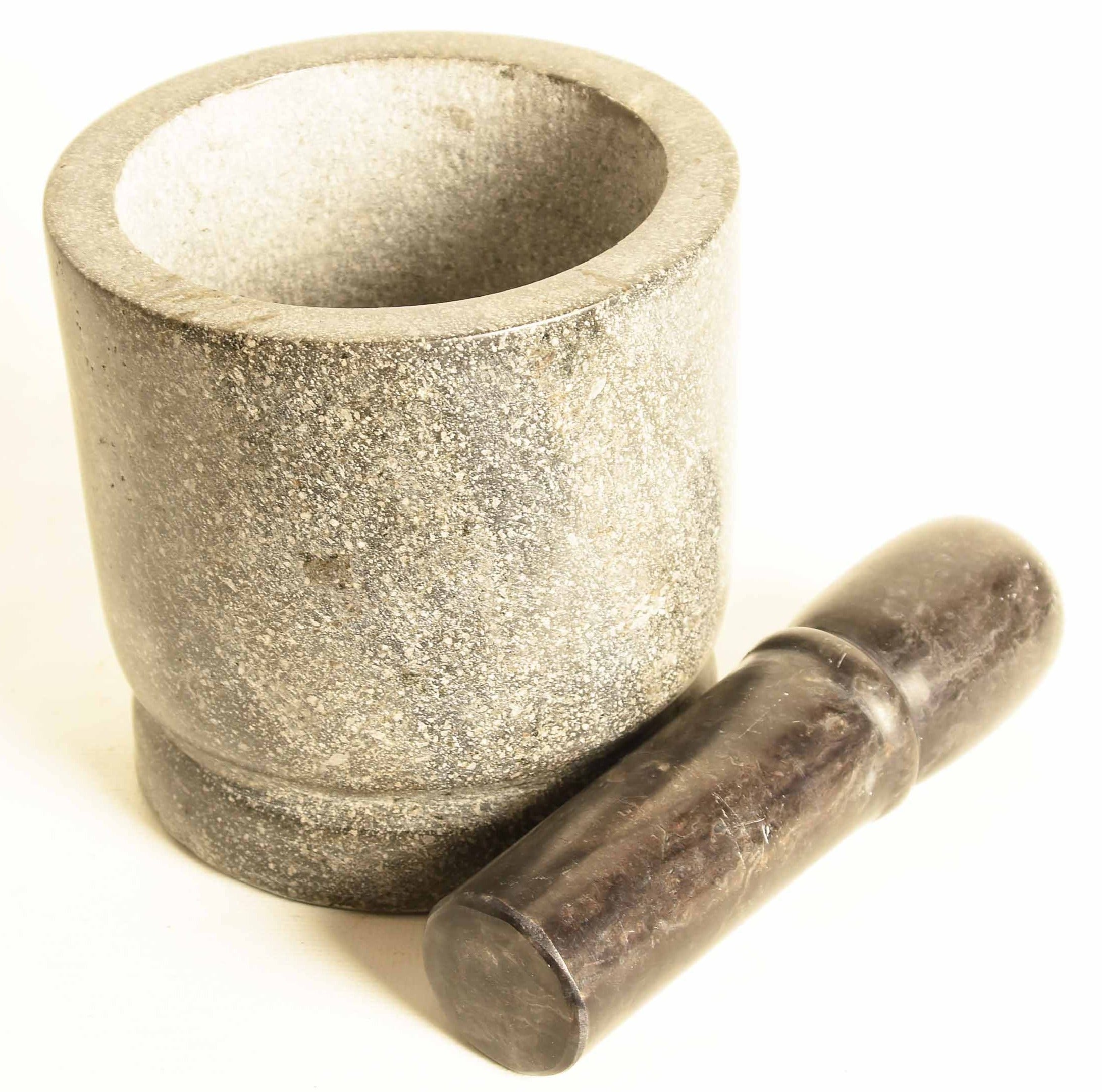 A handcrafted stone mortar and pestle made in Indonesia. As these are a natural stone product, the colour and shape may vary from the one pictured.