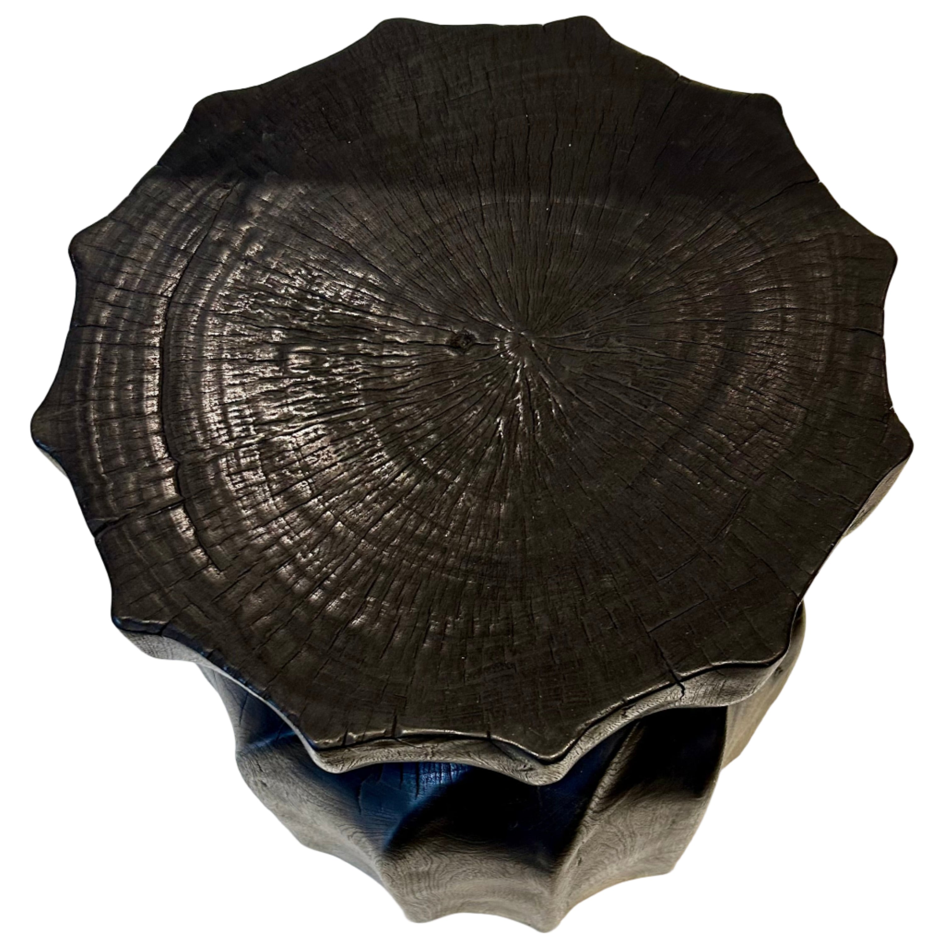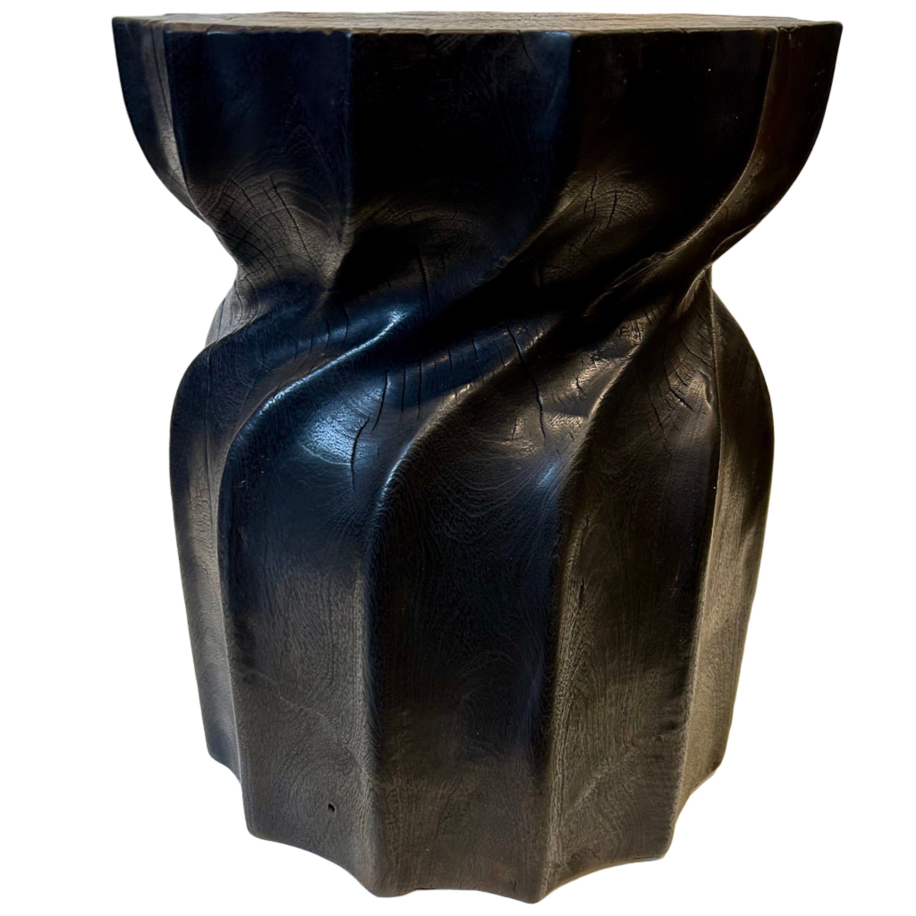 This ebonized side table made from one piece of solid timber has a twisted form that puzzles the mind. It is a sculptural piece that adds style and individuality to any contemporary home.