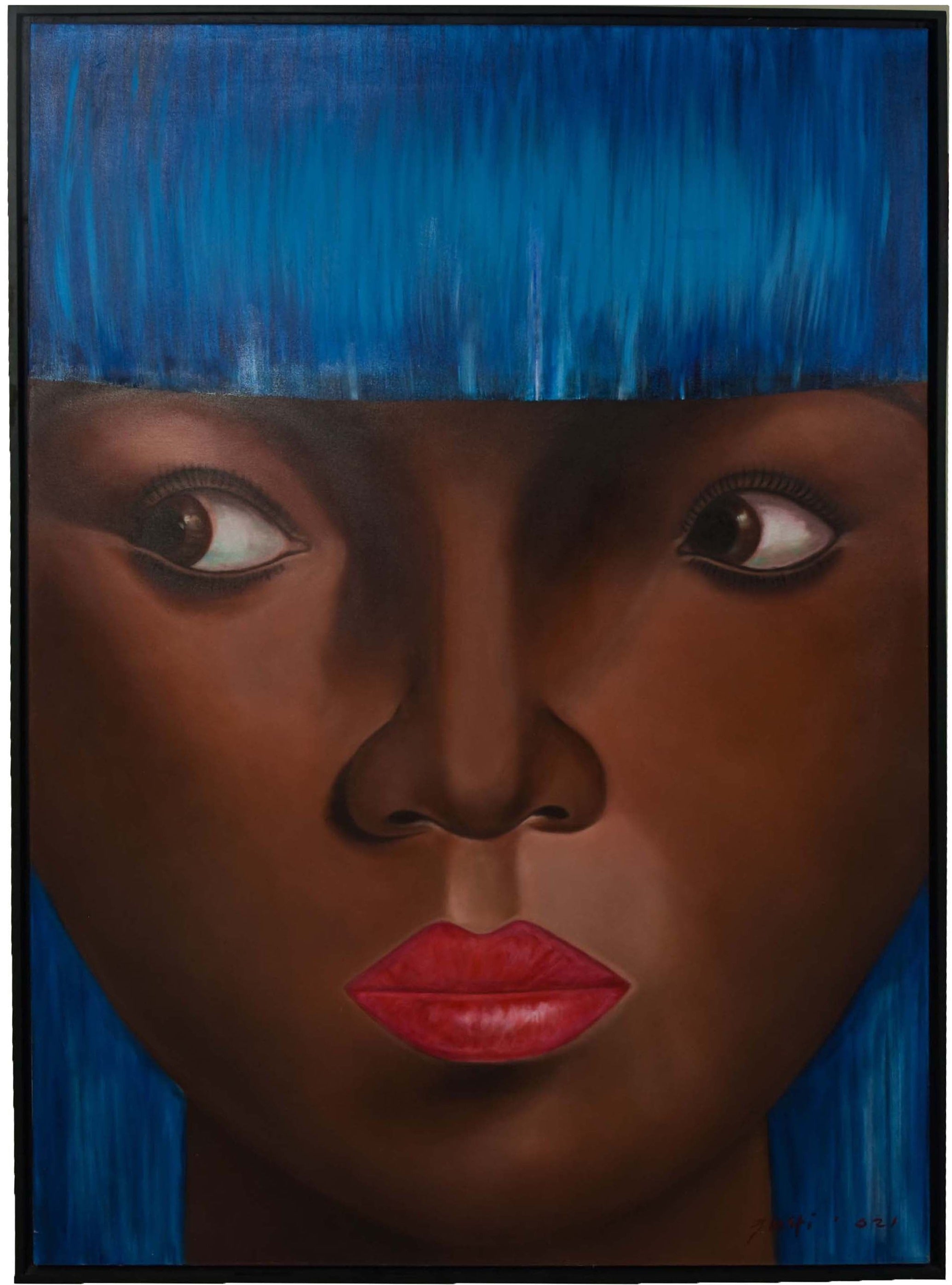 "The Girl with the Blue Hair" is a striking and graphic close-up portrait of a beautiful Asian girl, rendered with meticulous detail and vibrant expression. The composition emphasizes bold color, creating a modern, captivating visual impact.