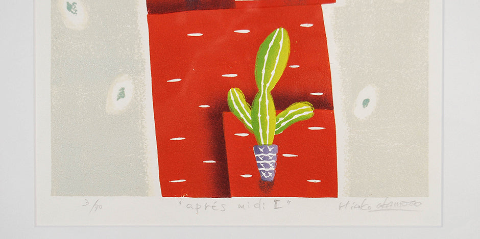 Her prints, like 'Après Midi', often evoke a sense of peaceful reflection and quiet moments. She may depict figures, landscapes, or abstract patterns, but always with a focus on balance, harmony, and the natural world. Okamoto’s ability to convey a deep sense of stillness and contemplation has made her a respected name in contemporary Japanese woodblock art.