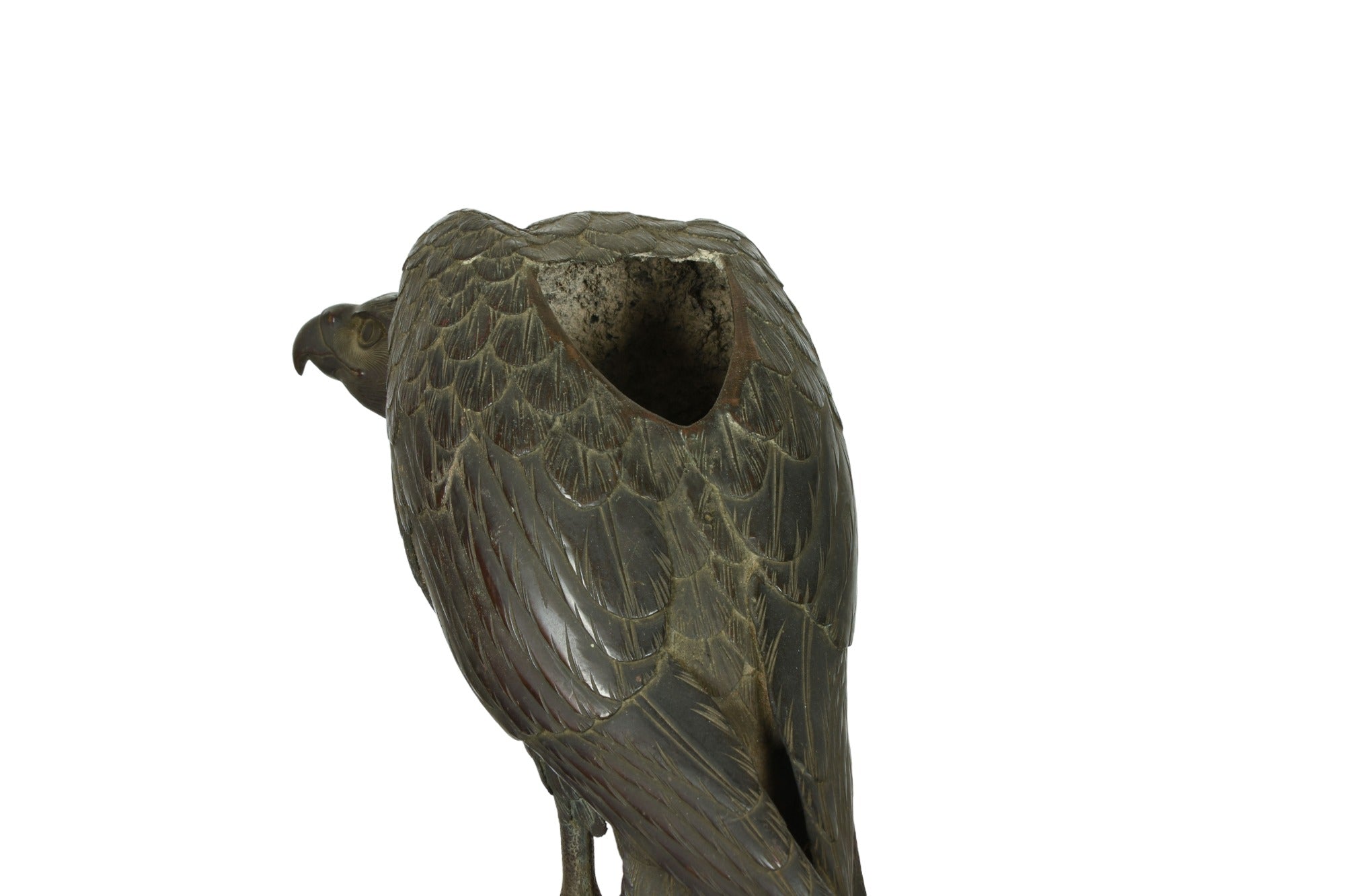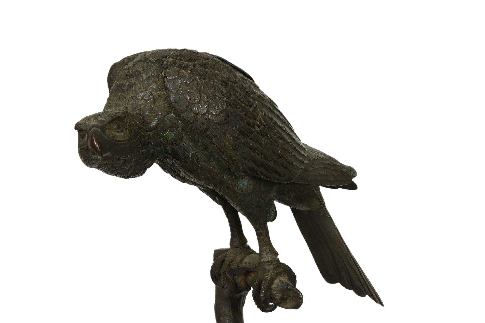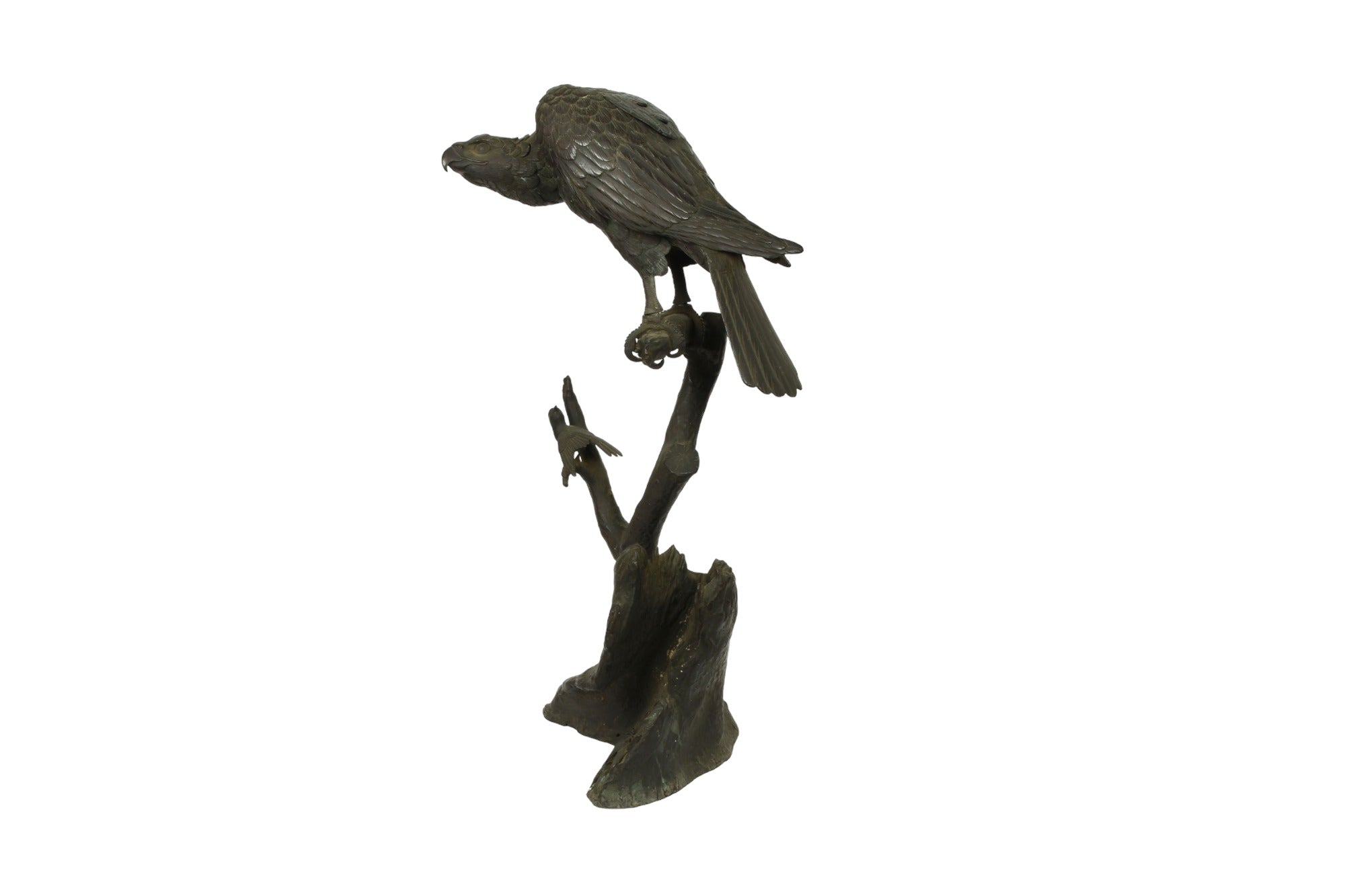 Japanese bronze incense burner (Koro) in the sculptural form of a Hawk resting on a tree branch. Meiji period circa 19th century.
