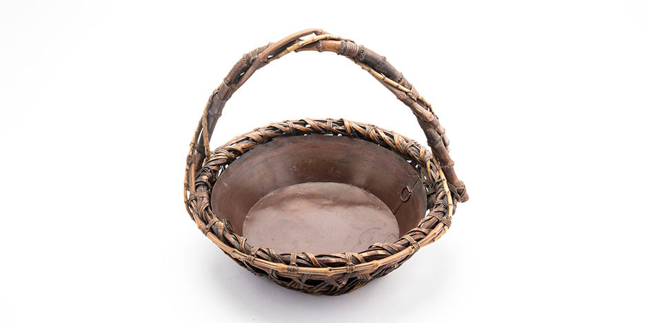 Signed Japanese woven bamboo ikebana flower arrangement basket with copper insert