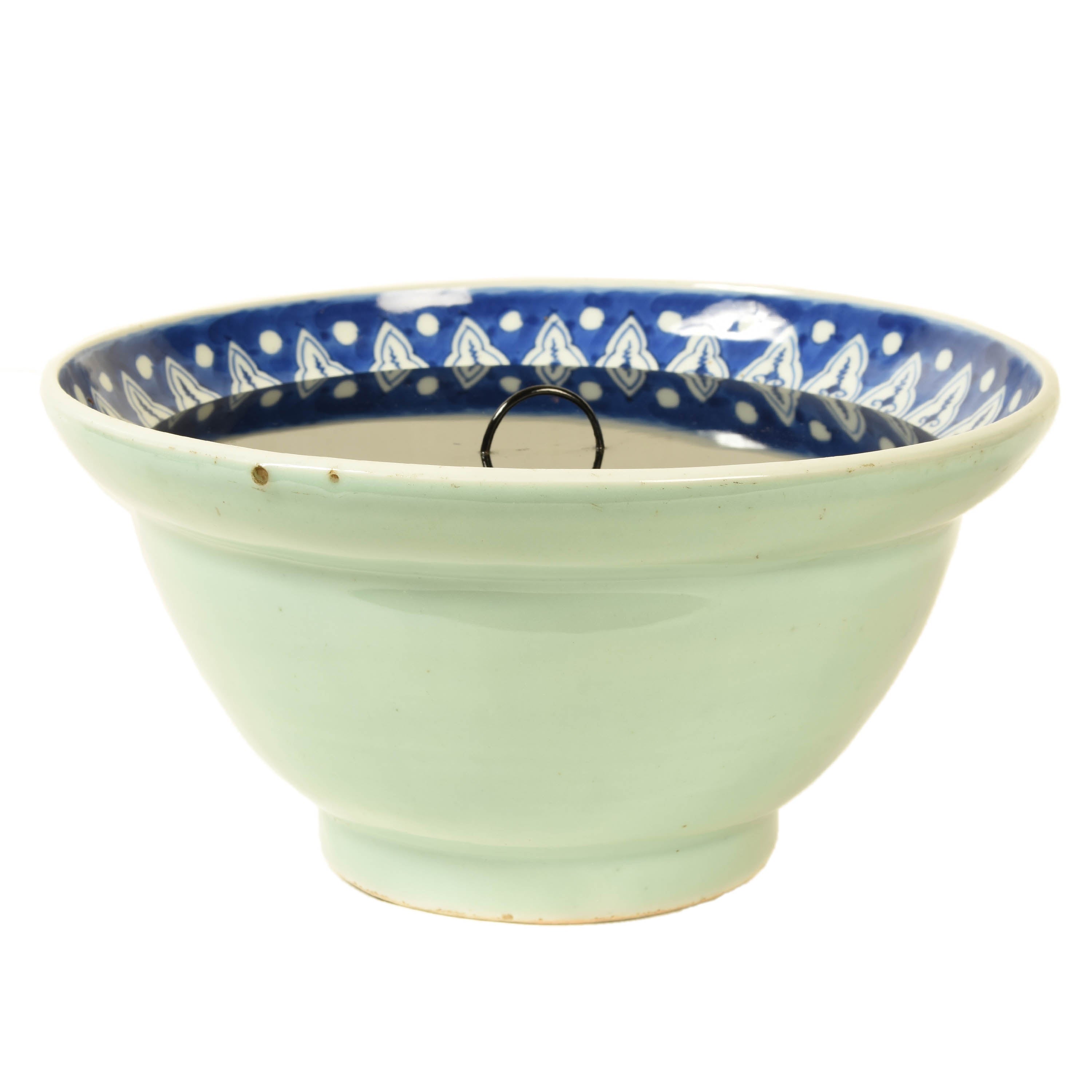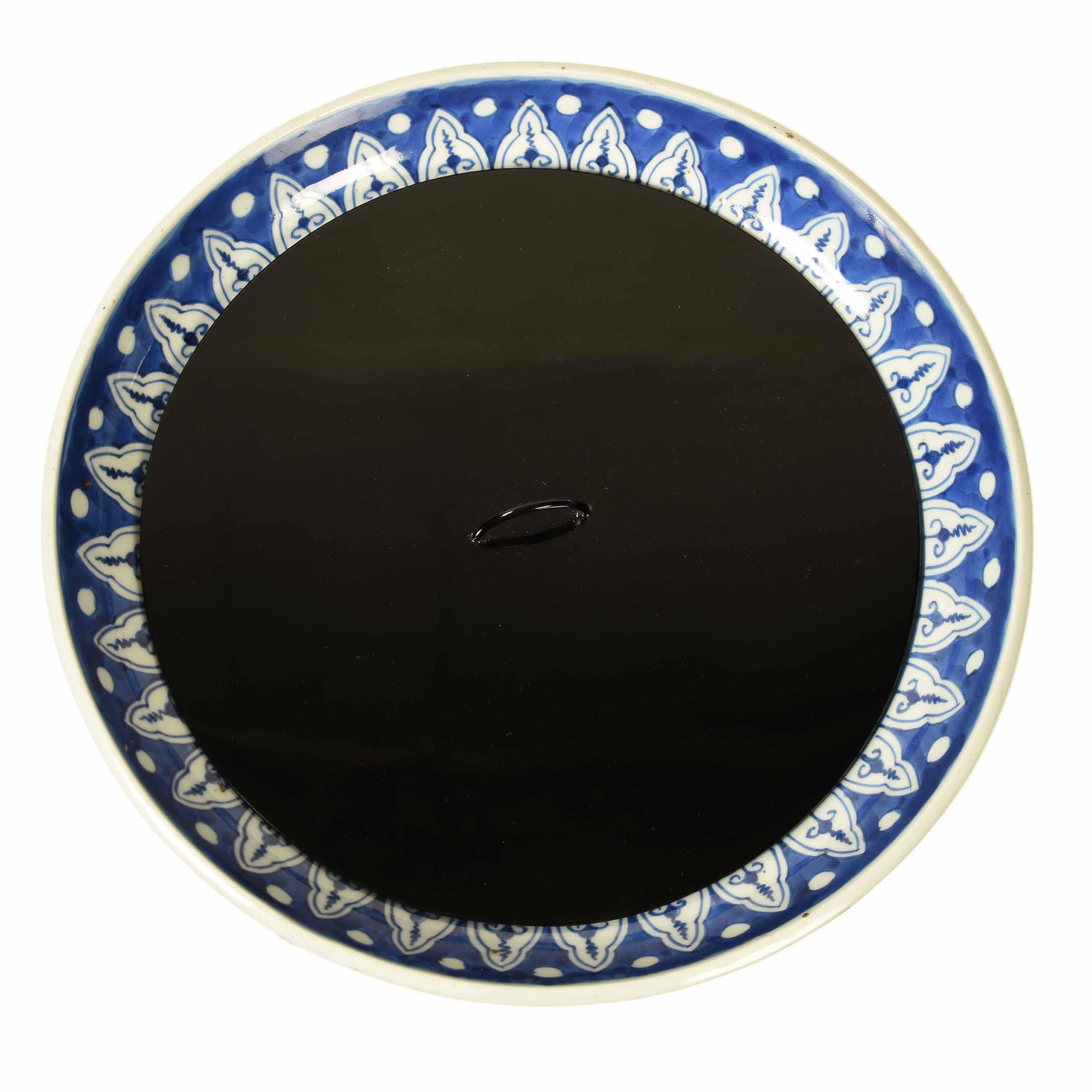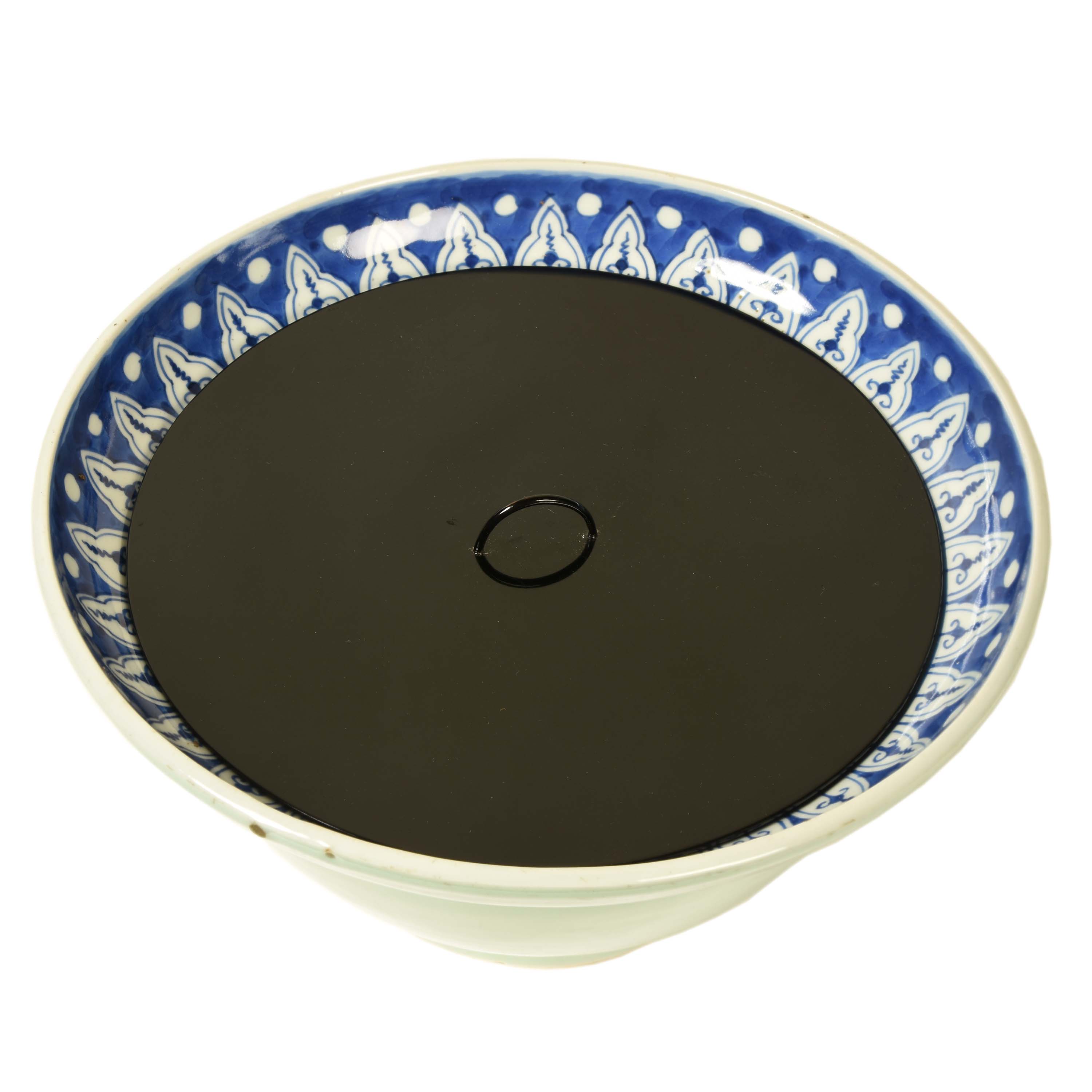 A Japanese celadon bowl with blue and white underglazed patterned interior, converted into a mizusashi by the addition of a detached black lacquer lid. Meiji period, late 19th century.
