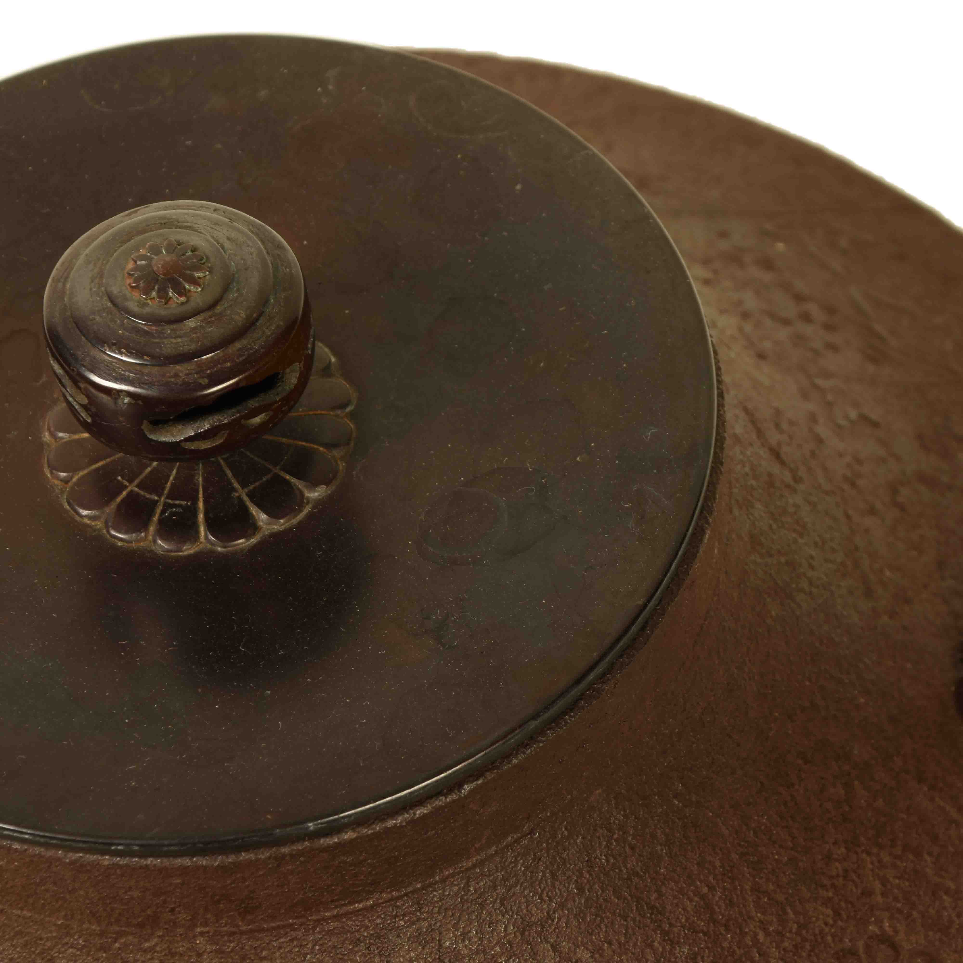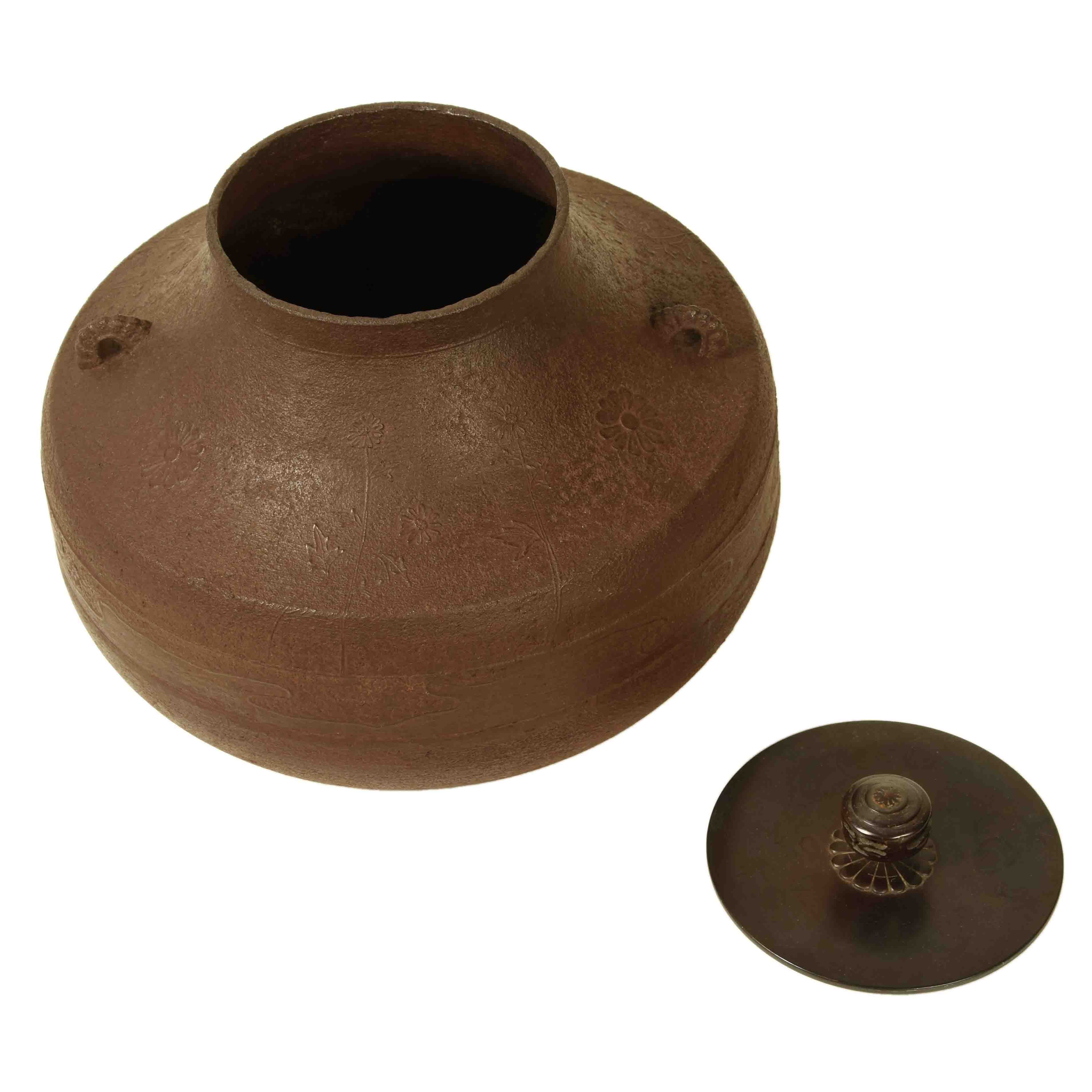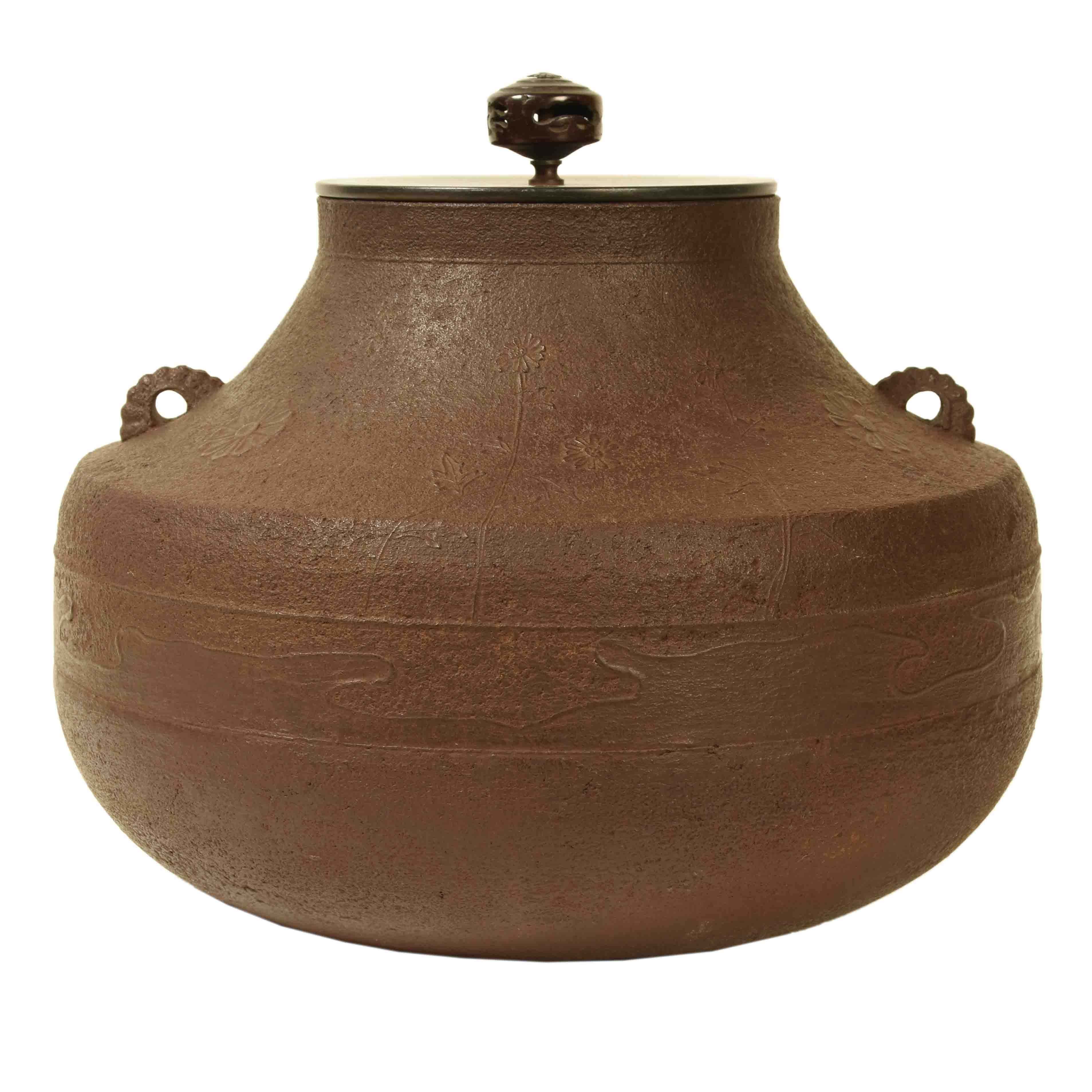 A Japanese iron kama, hot water kettle for tea ceremony, elegantly shaped with a delicate finial and an embossed floral design.