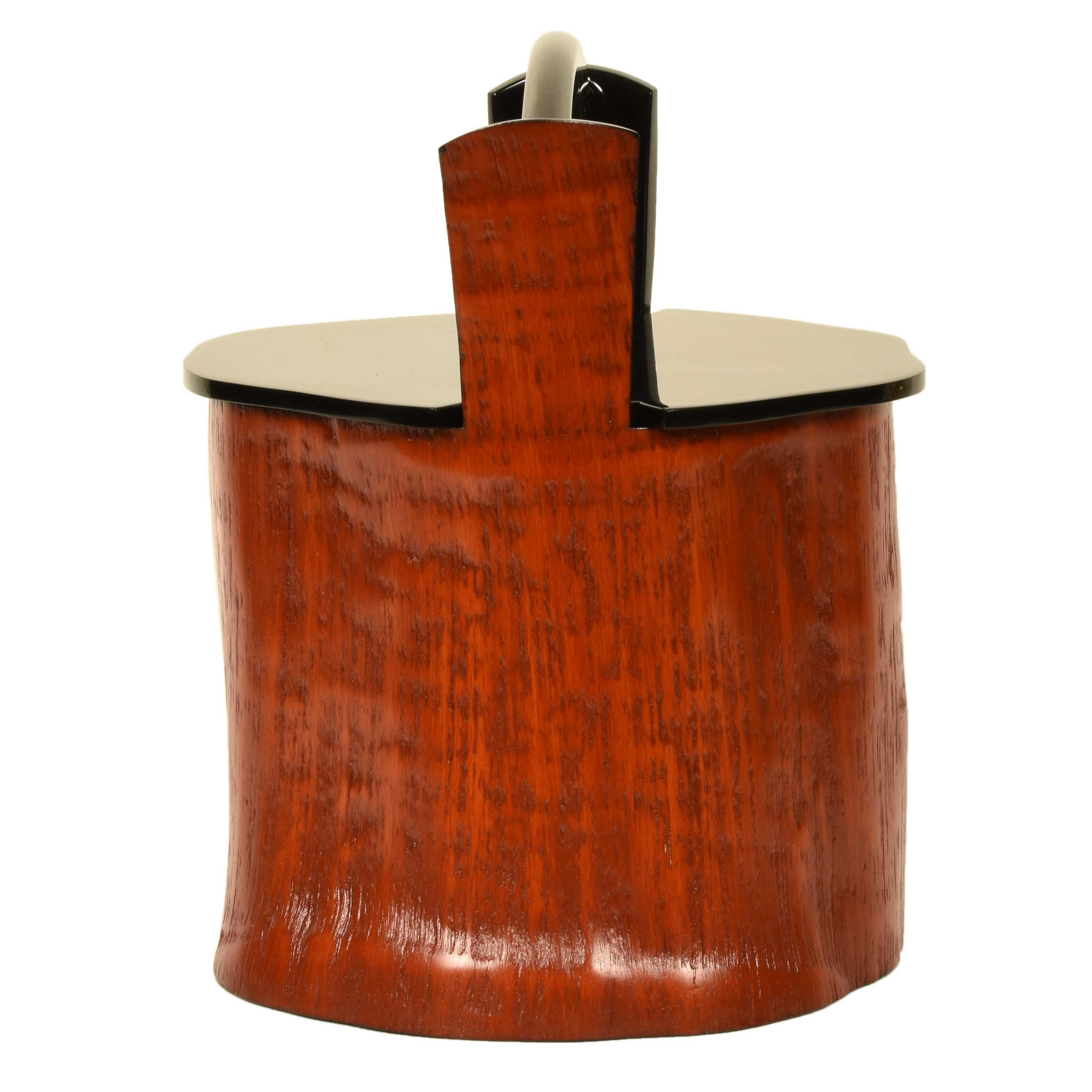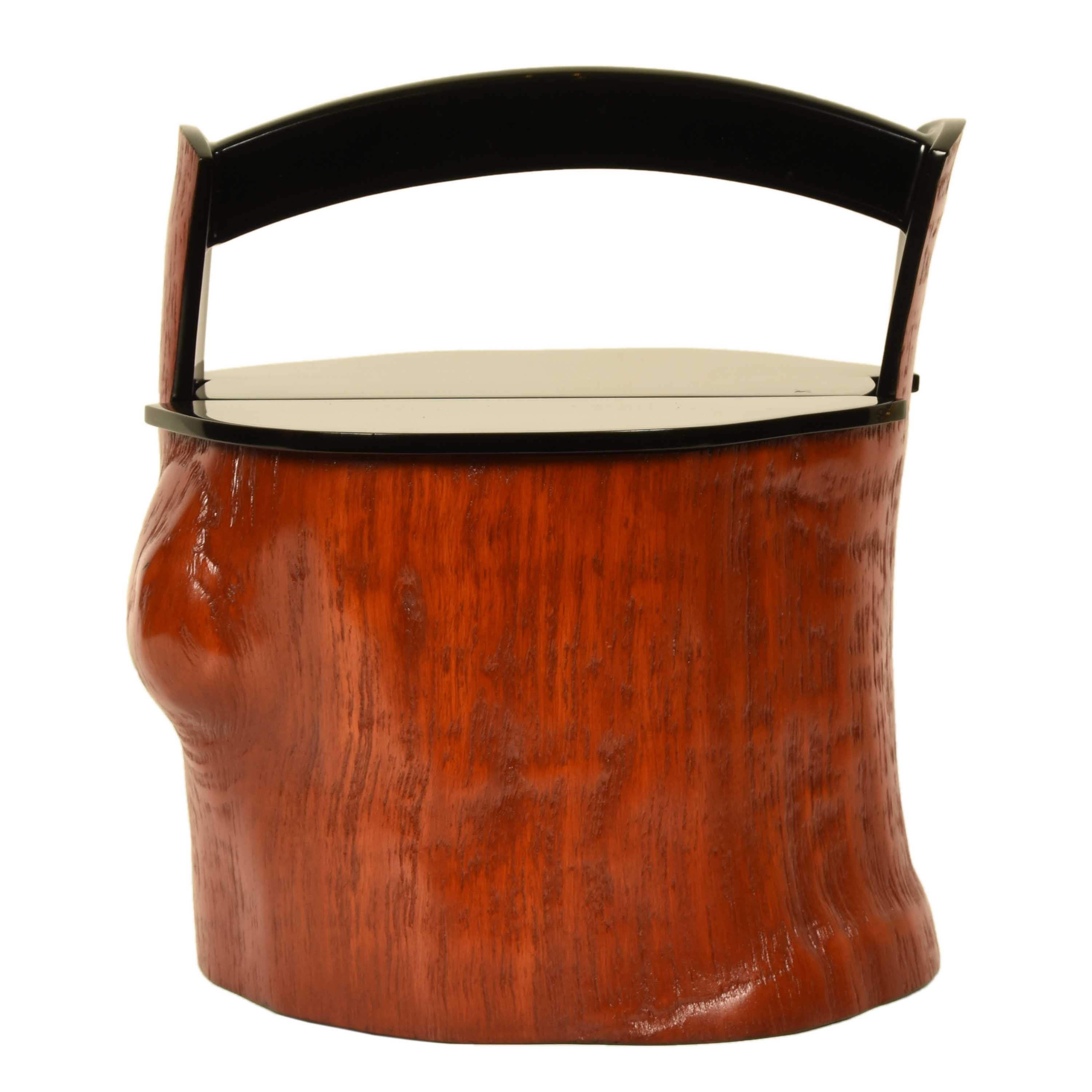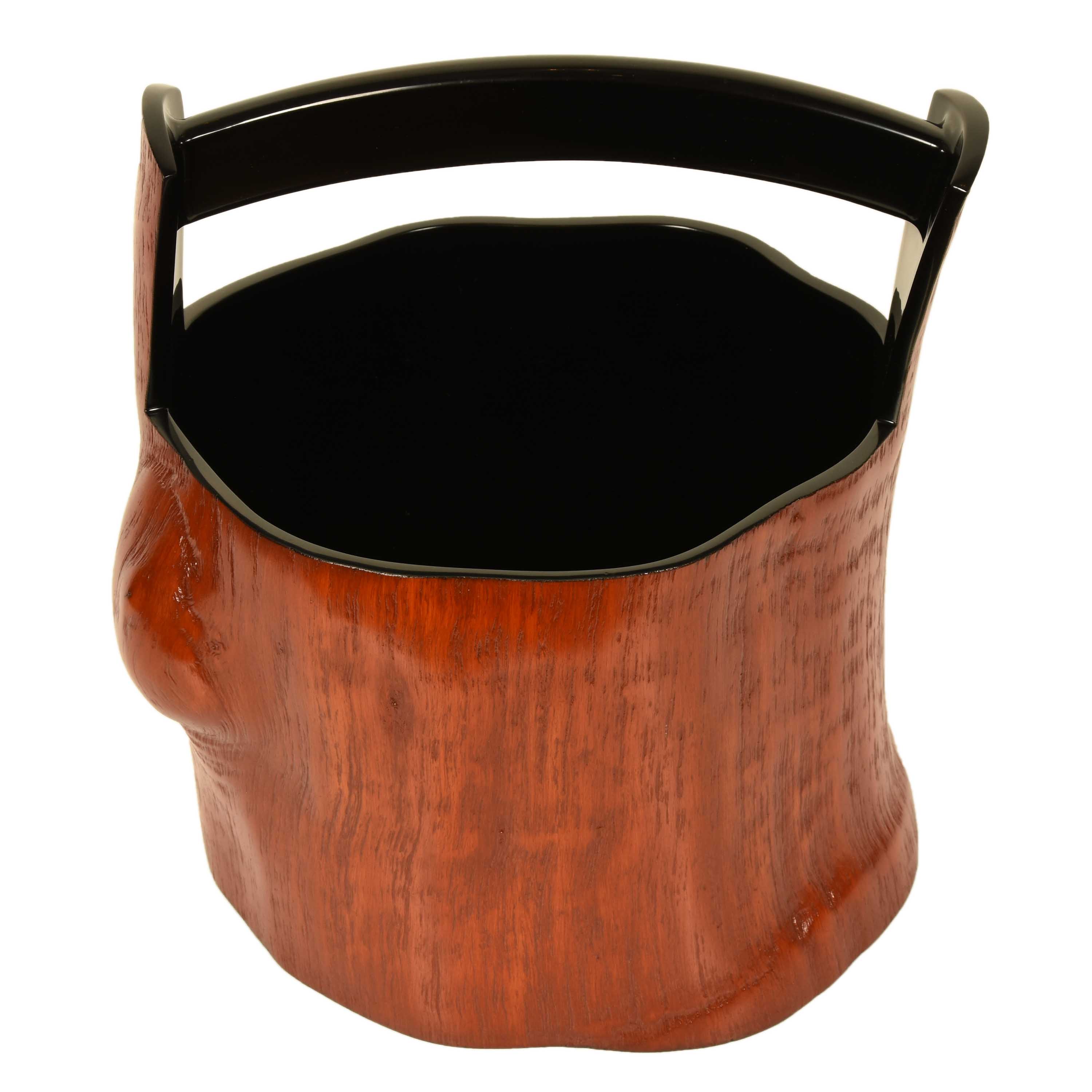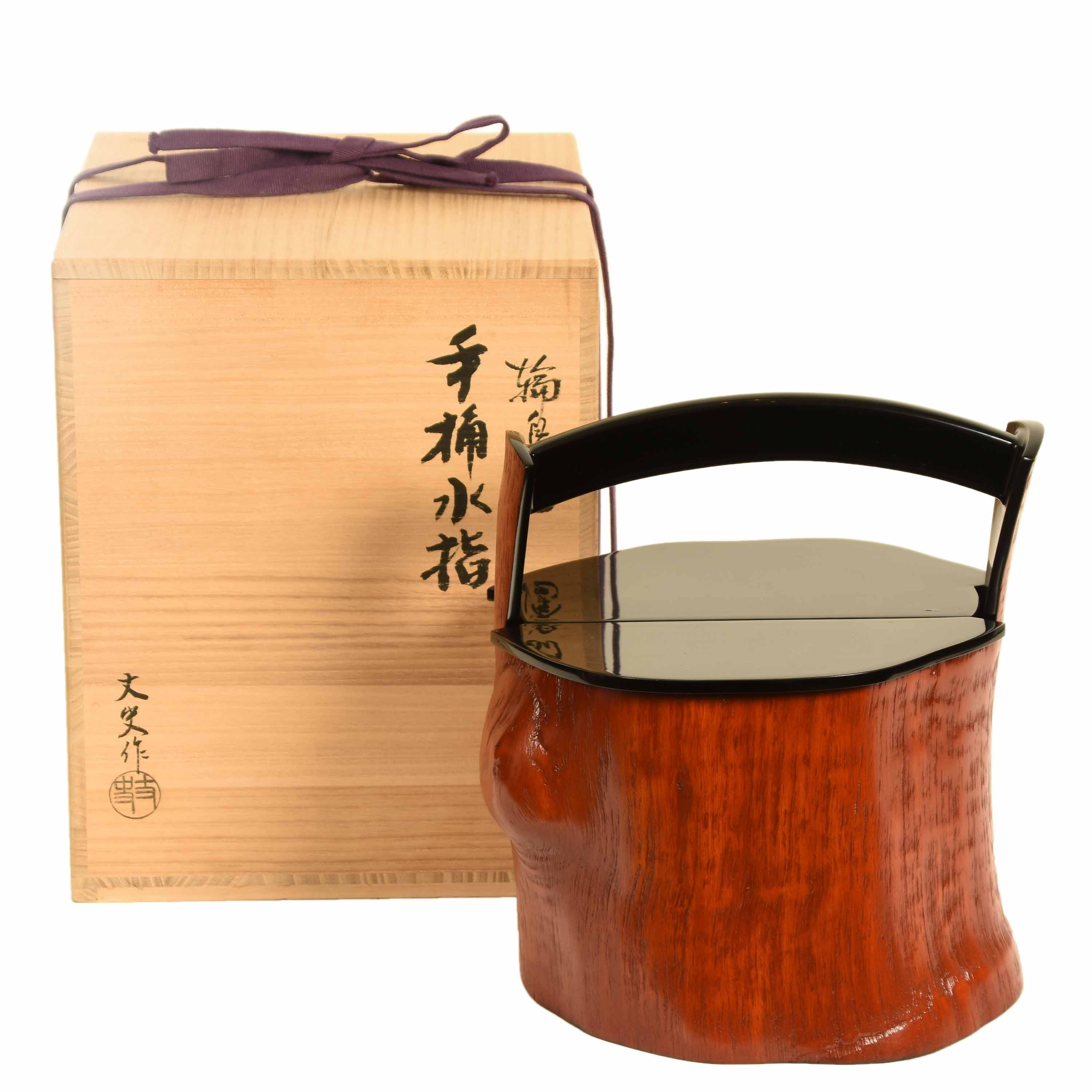 An unusual Japanese mizusashi a water container used for tea ceremony. Made from a hollow branch and lacquered, with a black lacquer lid, interior and handle.