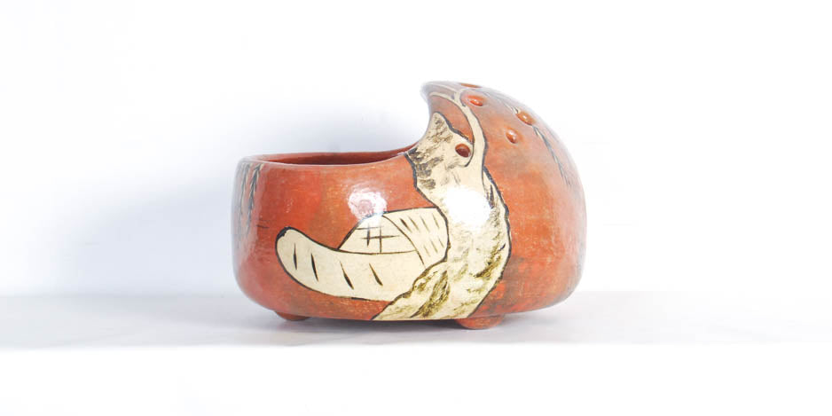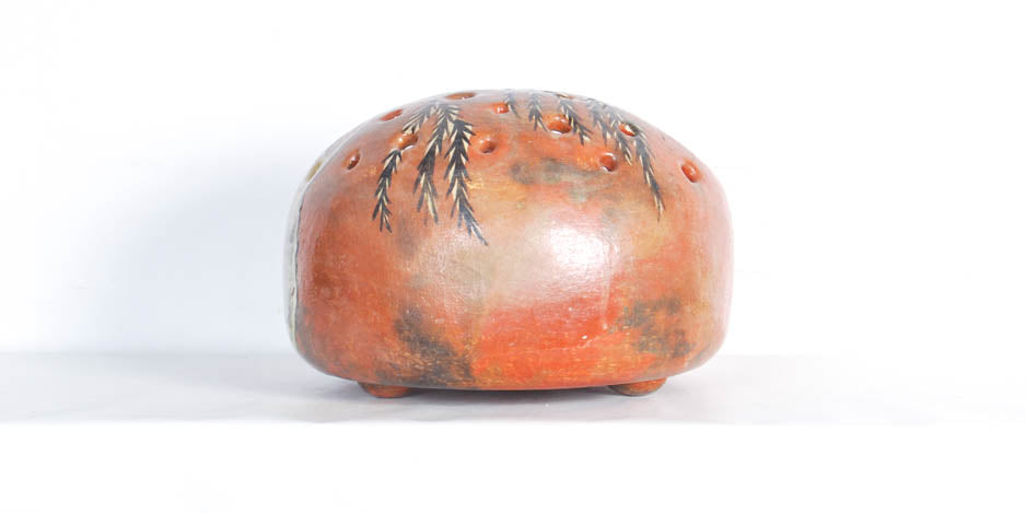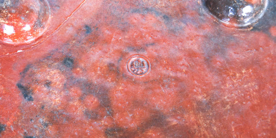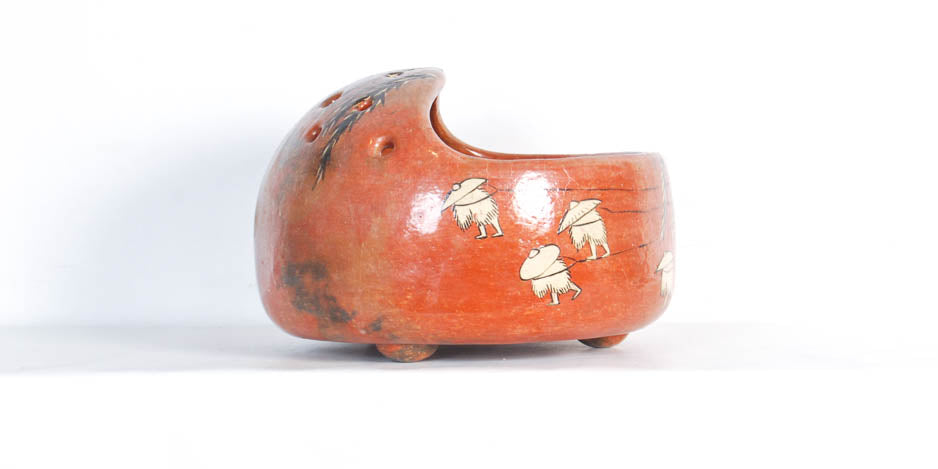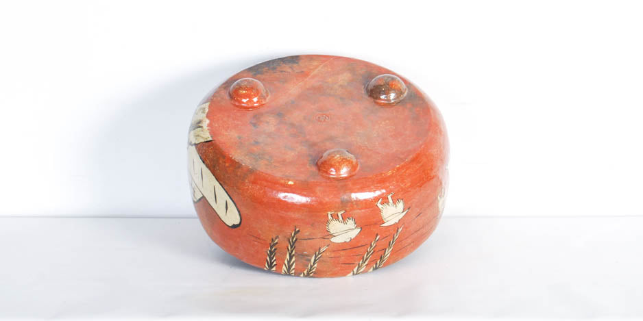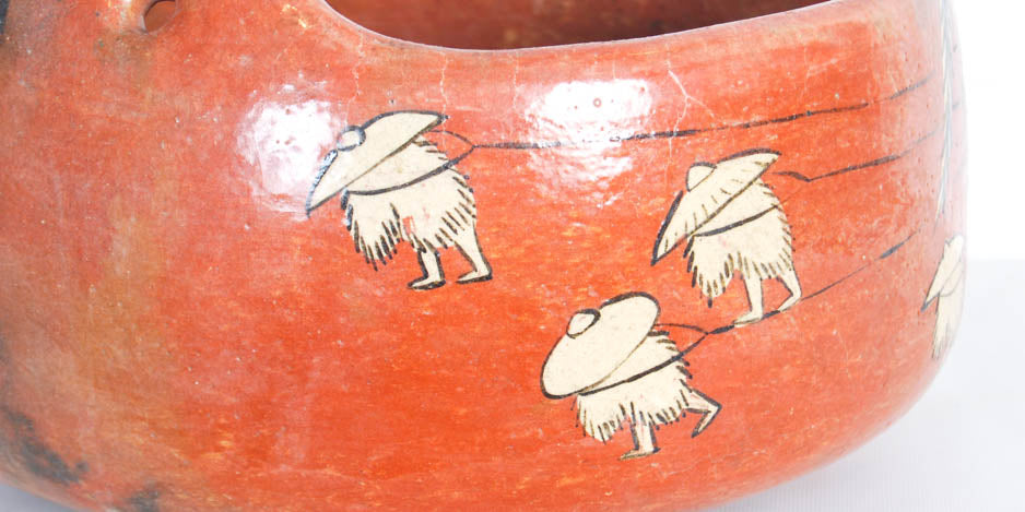 Antique Japanese 'Raku' pottery tea ceremony 'hibachi' (charcoal brazier) with a glazed design of fisherman in straw coats pulling their boat along shallow waters beneath the branches of an ancient willow tree, Meiji period, C19th century