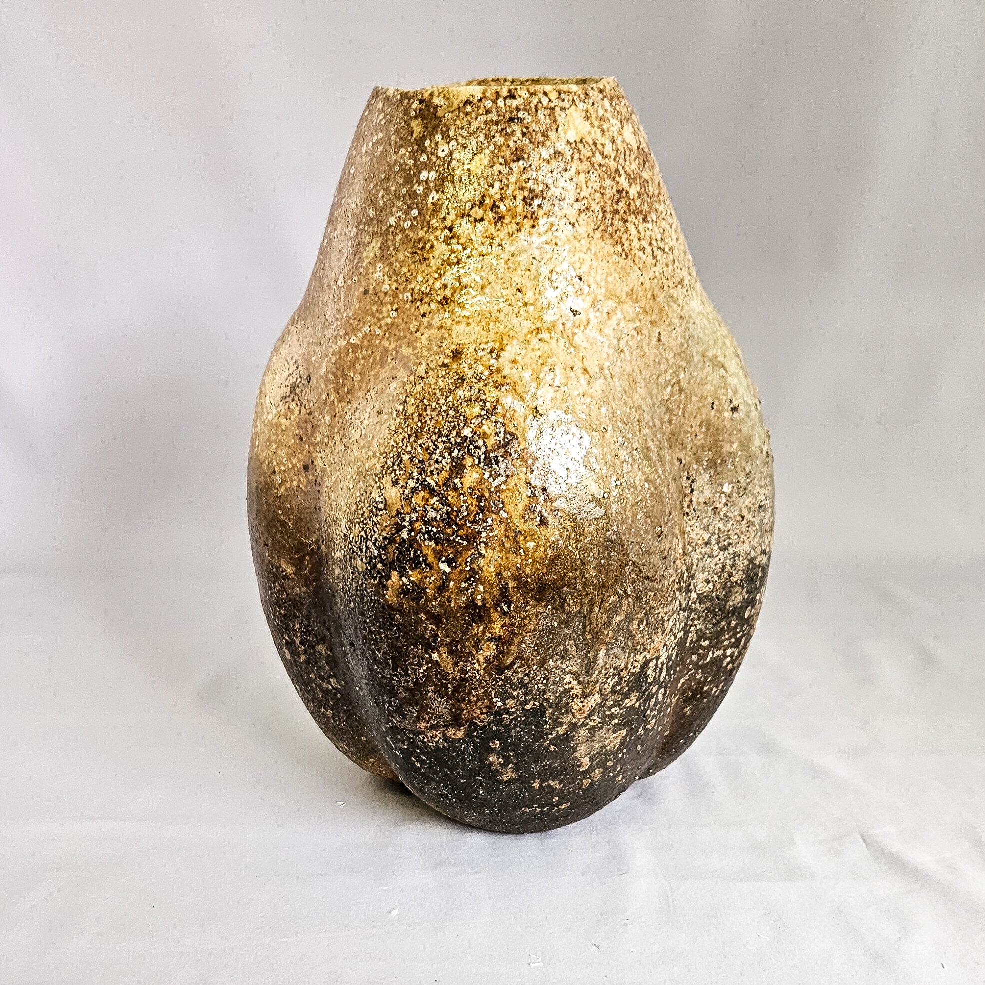 This Shigaraki pottery vase showcases Japan’s timeless ceramic artistry. Its bulb-shaped form is finished with a textured brown and white glaze, accented by a subtle hint of orange. The organic surface and earthy tones reflect the rustic charm of traditional wood-fired pottery, making it a striking Ikebana vase or standalone display piece.