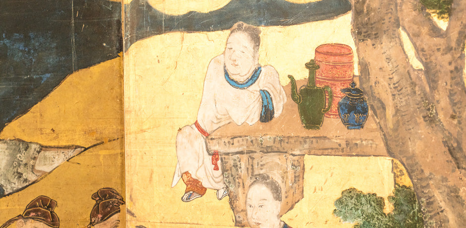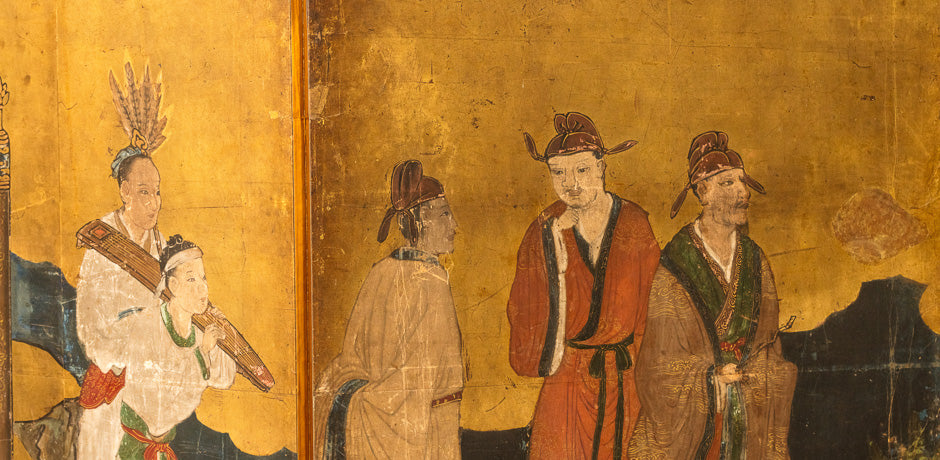 Japanese 6-Panel Screen, 17th Century – Chinese Scholars with a Blossom & Pine Landscape