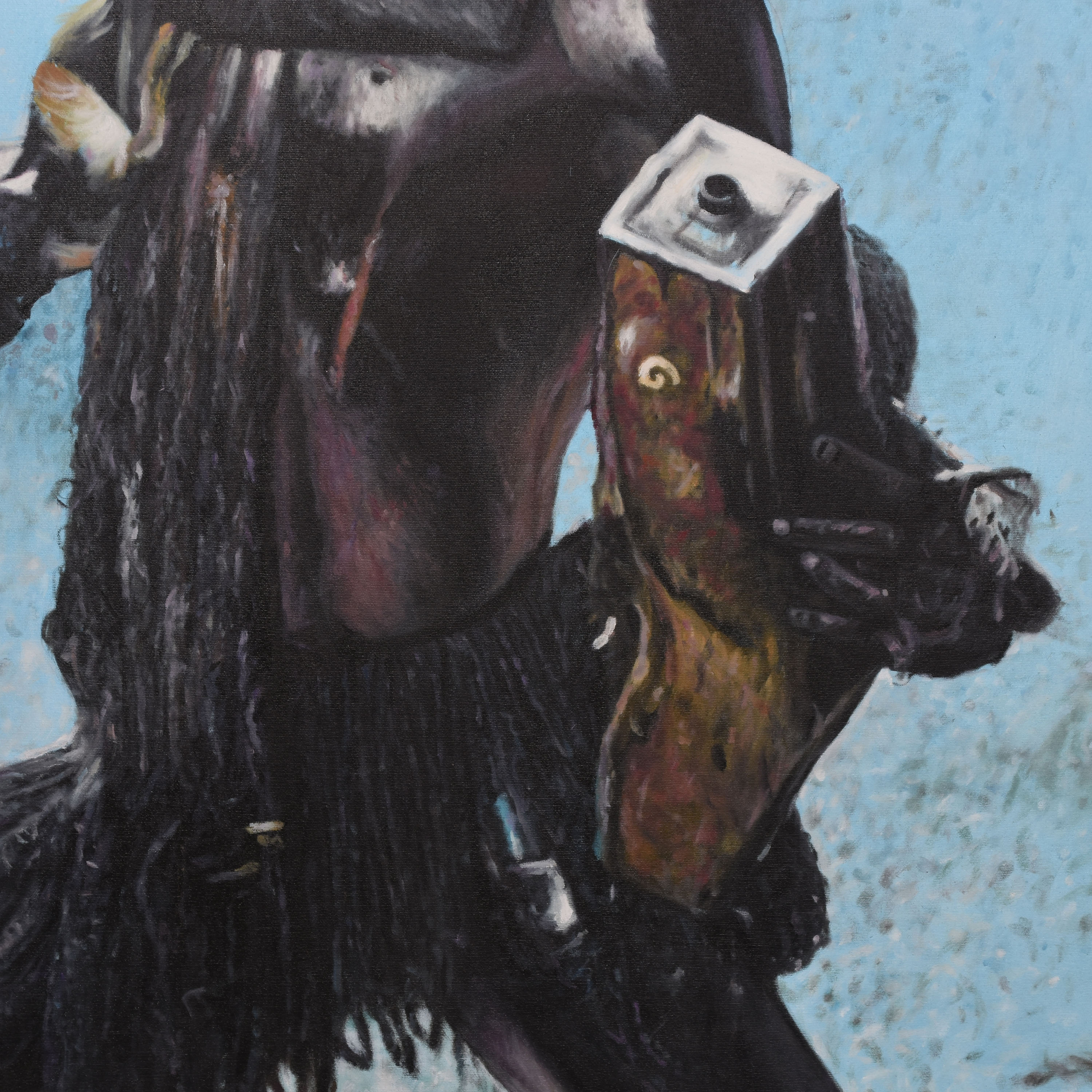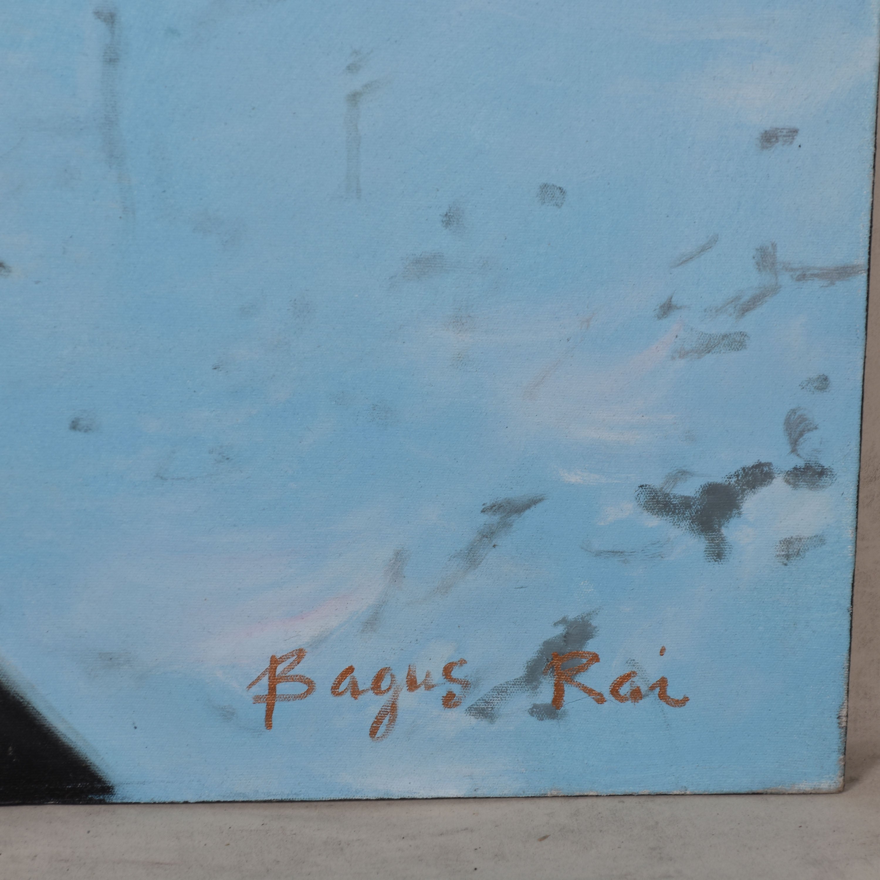 The dancer’s posture, clothing, and gesture suggest energy and celebration, while the layered textures and expressive palette give the piece a raw, almost tactile vitality. Rai’s signature style blends figurative detail with abstract elements, creating a powerful visual impact that draws the viewer into the performance.