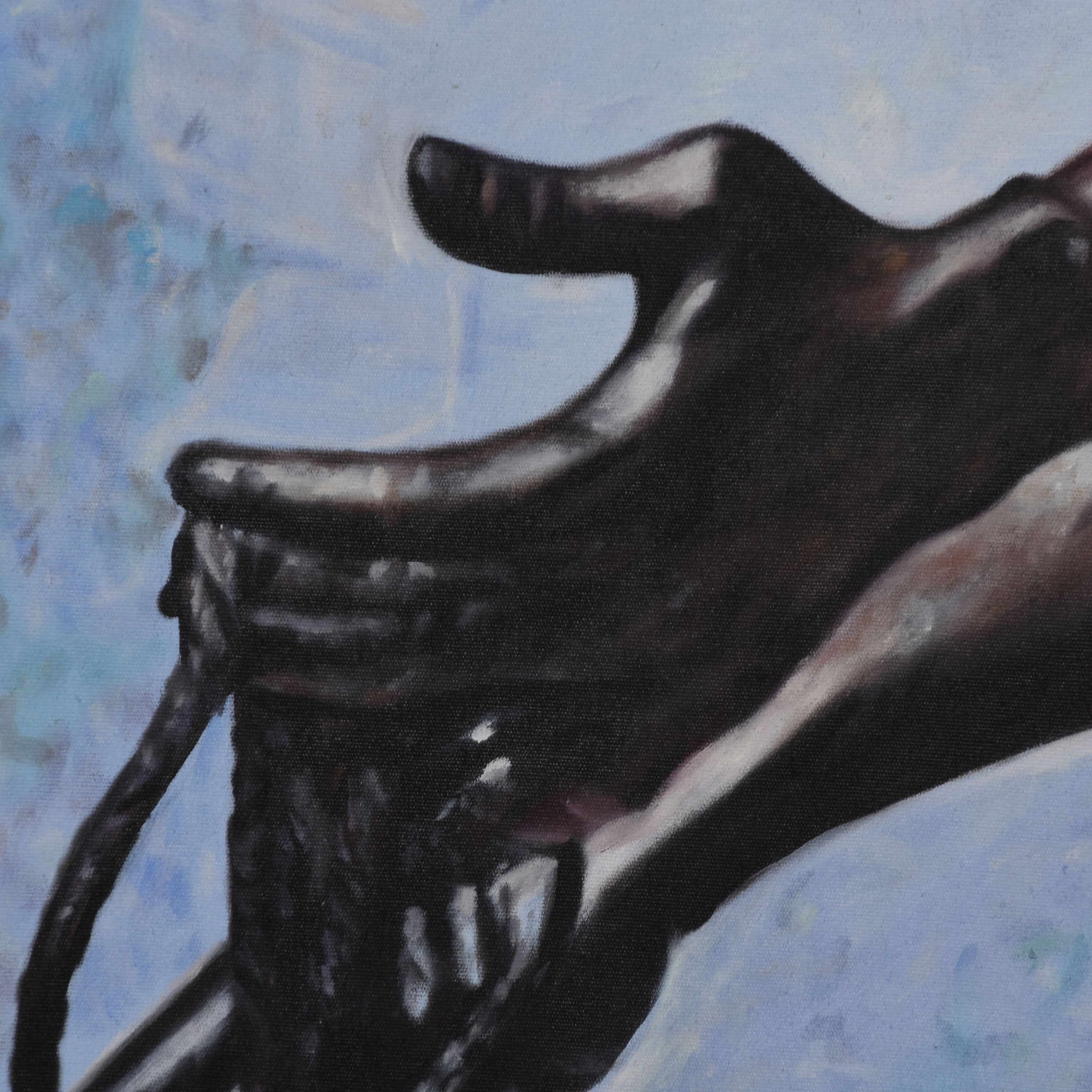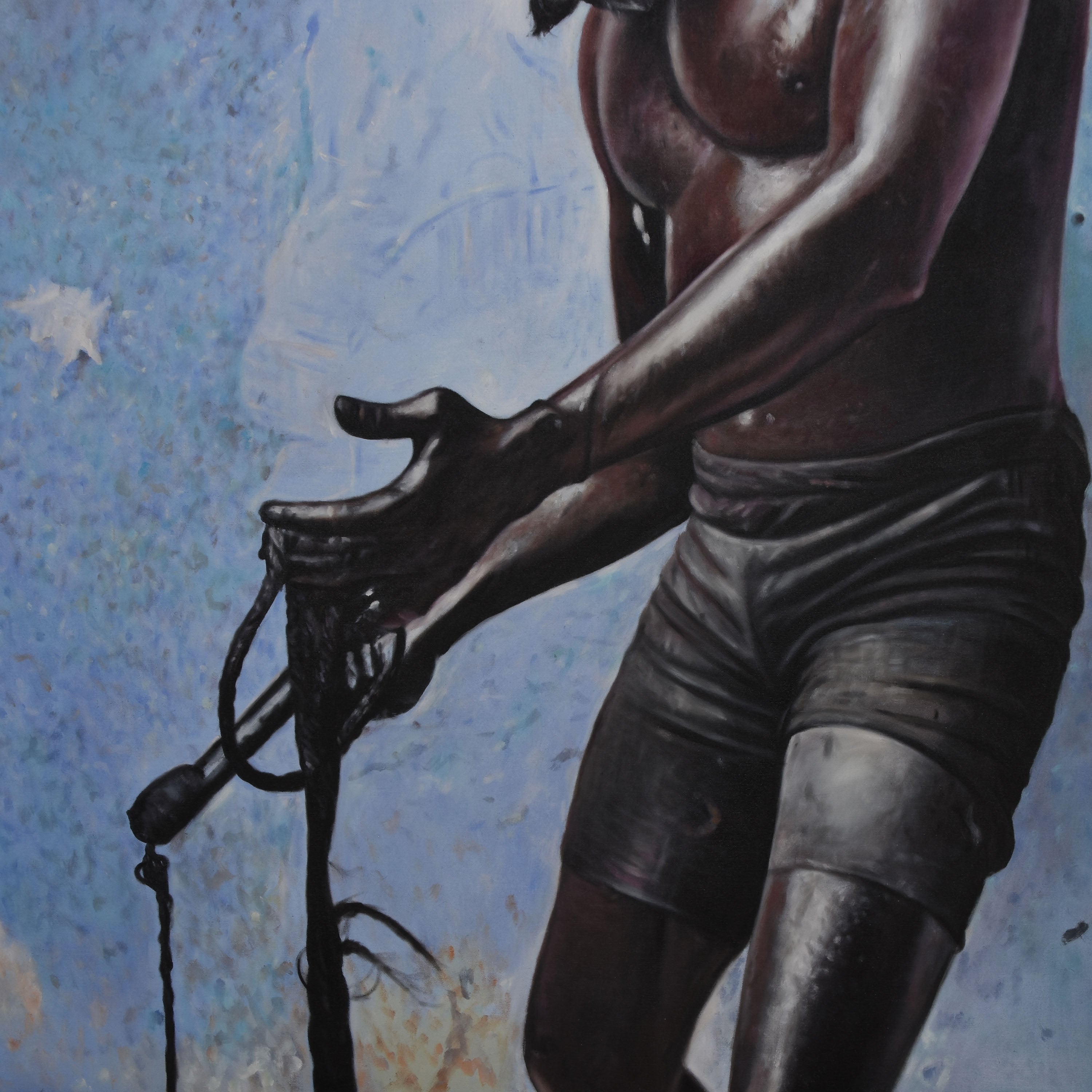 The dancer’s posture, clothing, and gesture suggest energy and celebration, while the layered textures and expressive palette give the piece a raw, almost tactile vitality. Rai’s signature style blends figurative detail with abstract elements, creating a powerful visual impact that draws the viewer into the performance.