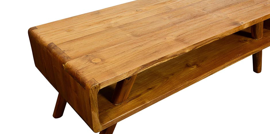 This contemporary Scandinavian-style coffee table or entertainment unit is crafted from sustainably sourced solid teak, known for its durability and rich, natural beauty. Finished with a natural wax finish, it enhances the wood’s inherent grain while offering a smooth and refined surface. The design is inspired by Mid-Century Modern (MCM) principles, combining clean lines, simplicity, and functional elegance.