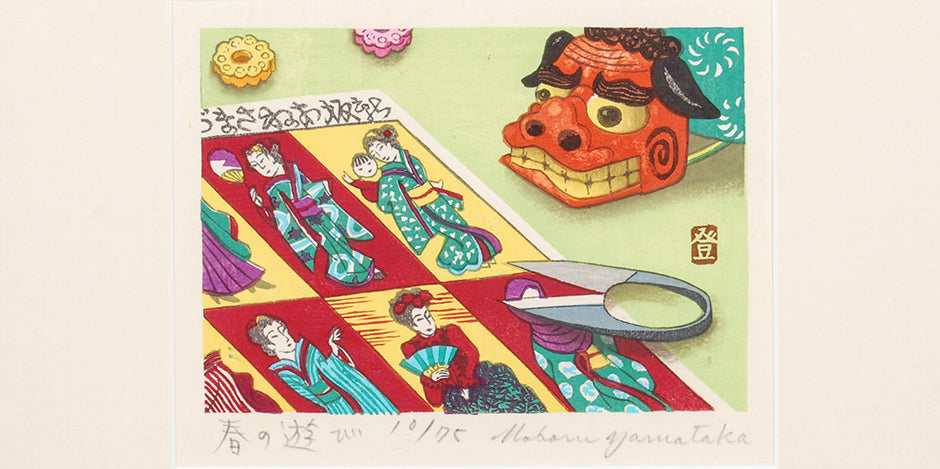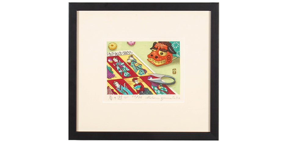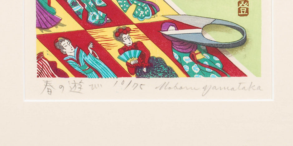 Contemporary Japanese Woodblock Print by Yamataka Noboru – 'Spring Playing' (Meiji Paper and Shishi Head and Scissors)