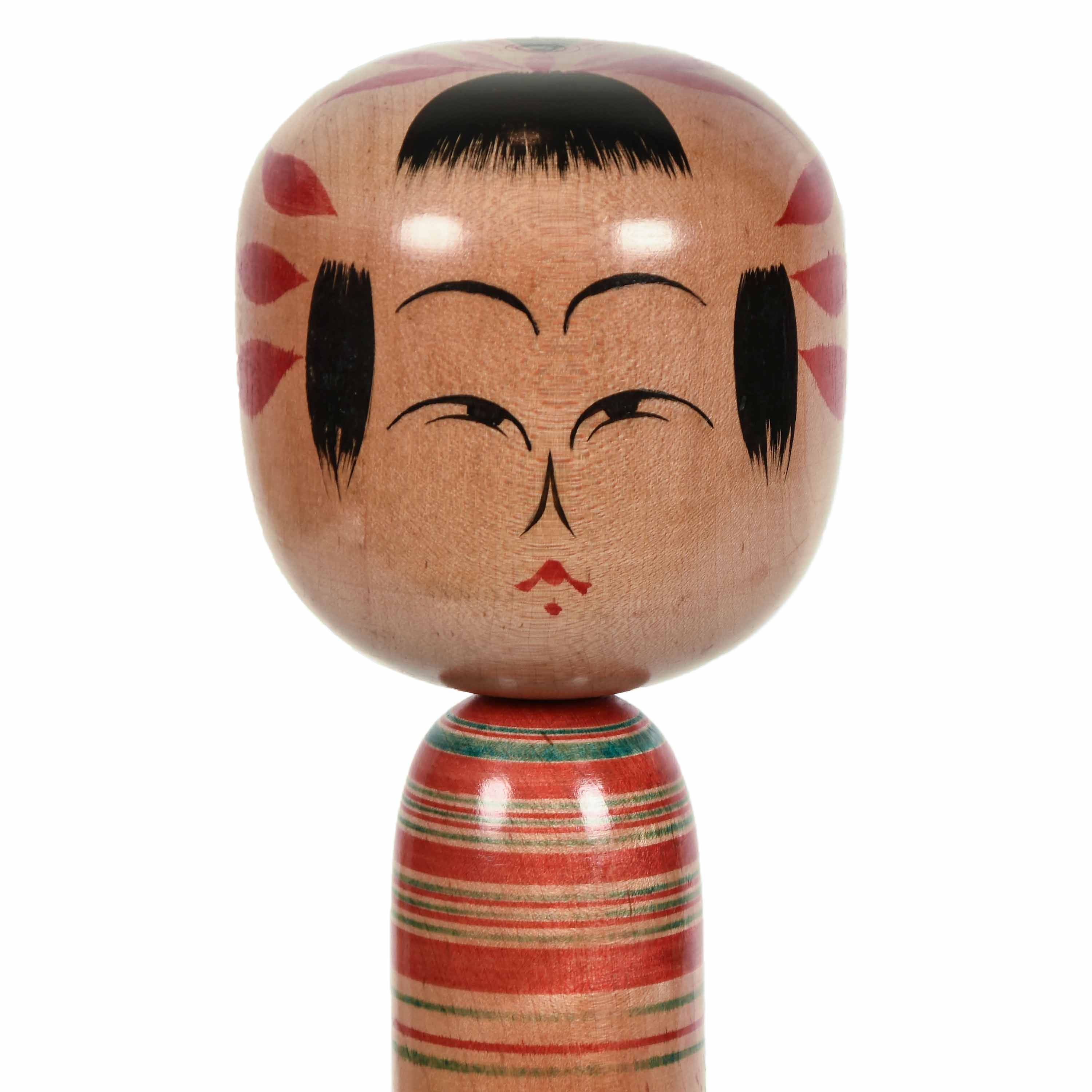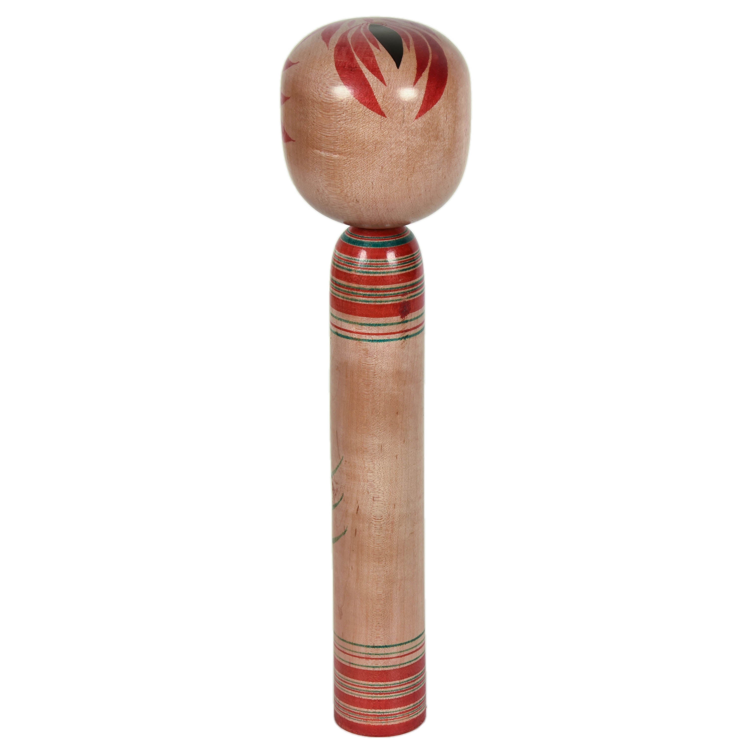 A vintage traditional Japanese kokeshi. She has a delicately painting split nose and red double lips with a single bang and dragonfly ponytail. She has a stylized floral design on her kimono in red and green. Signed on the base.