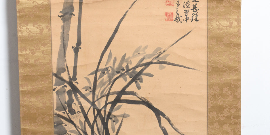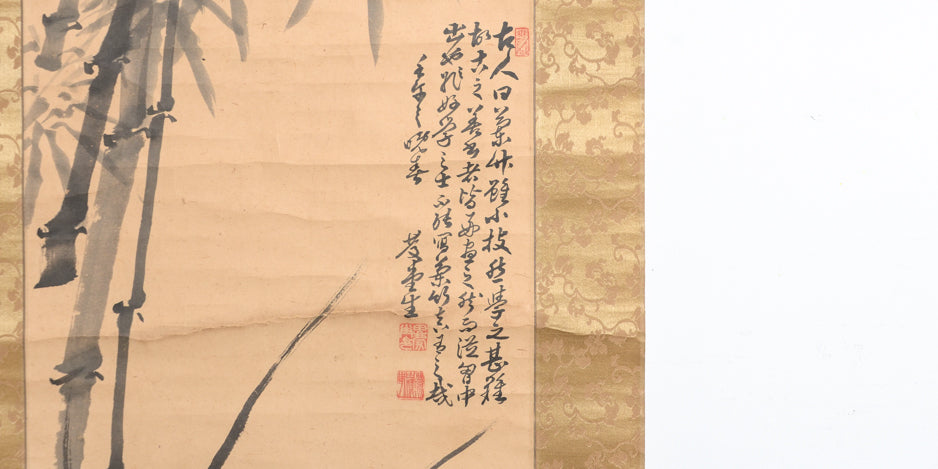 This vintage Japanese scroll features a serene and elegant depiction of bamboo stalks, created with ink on paper. Bamboo is a prominent motif in Japanese art, symbolizing qualities such as strength, flexibility, and resilience. It often represents the ideal characteristics of a person—being able to bend with the wind but not break. The minimalist and dynamic lines of the bamboo stalks are expressive of the artist's mastery in conveying both grace and strength through a simple yet powerful subject.