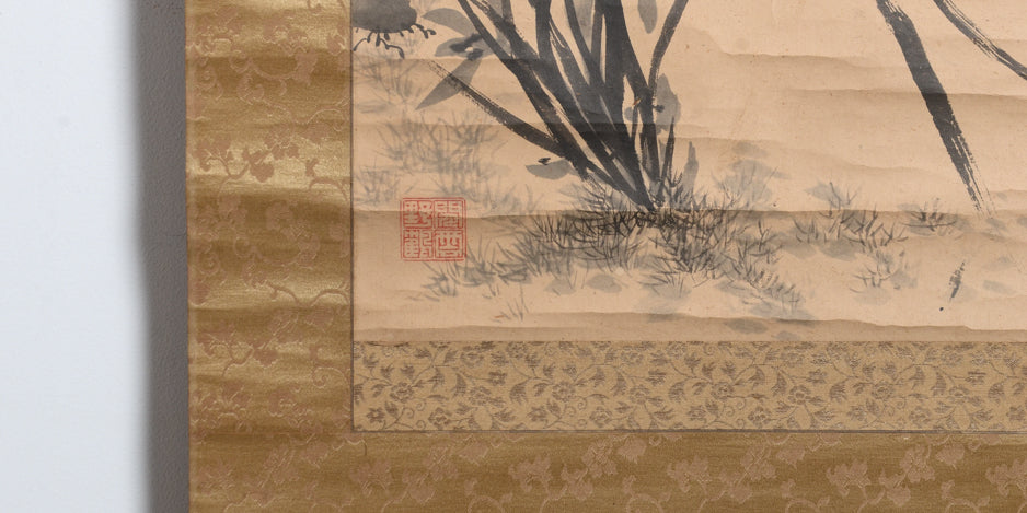 This scroll, painted in the 20th century, would add a sense of calm and contemplation to any space, making it perfect for meditative environments or areas where a connection to nature and the Japanese aesthetic of wabi-sabi (beauty in imperfection) is desired.