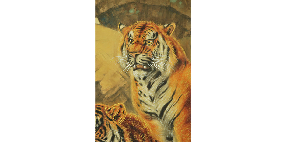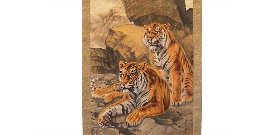 Signed by the artist, this scroll is a wonderful example of 20th-century Japanese painting traditions, blending classical composition with a heightened sense of realism. The pairing of tigers—a powerful symbol of protection, courage, and vitality—makes this a visually dynamic and symbolically rich piece for display.