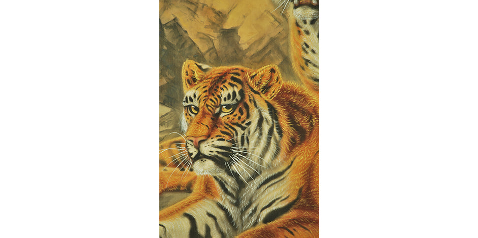 A striking vintage Japanese scroll painting featuring a realistically rendered pair of tigers, depicted in vivid colour on fine silk. Capturing both the raw power and majestic stillness of these creatures, the artist has imbued the scene with life and movement through meticulous brushwork and nuanced shading.