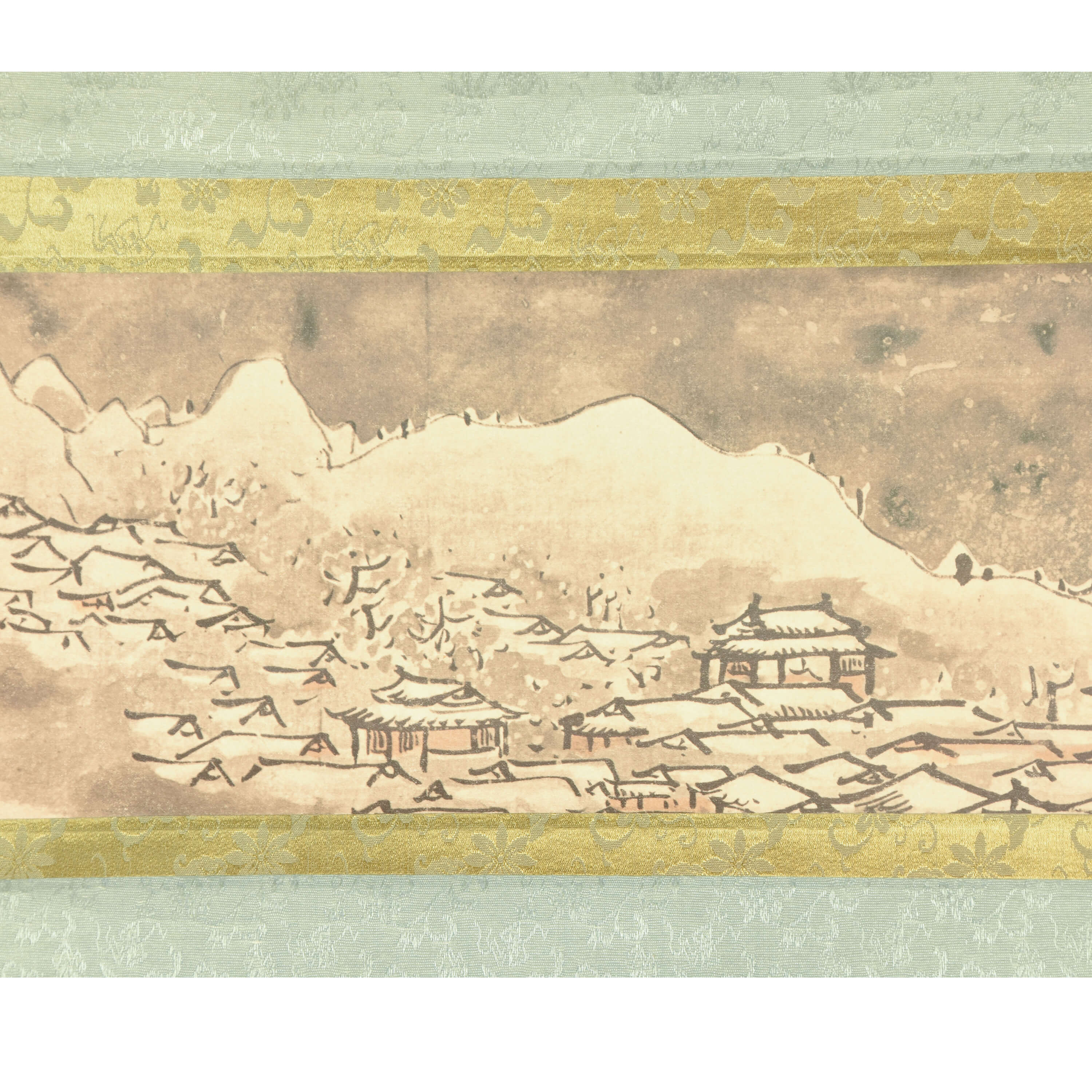 This Japanese scroll presents a landscape village scene, dating to the 19th century. The artwork likely depicts a traditional rural village, capturing the tranquility and simplicity of rural life in Japan during this period. These types of scenes were often used to convey a sense of harmony between nature and human habitation, with rolling hills, flowing streams, and small dwellings nestled in the landscape.
