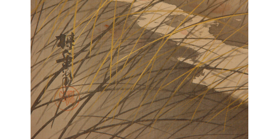 This vintage Japanese scroll features a serene and naturalistic depiction of two deer among reeds. The deer is a revered symbol in Japanese art, often representing gentleness, grace, and spirituality. The image of the deer, set amidst reeds, evokes a sense of peacefulness and harmony with nature, reflecting the Japanese aesthetic of wabi-sabi (the beauty in imperfection) and the connection between the natural world and human experience.